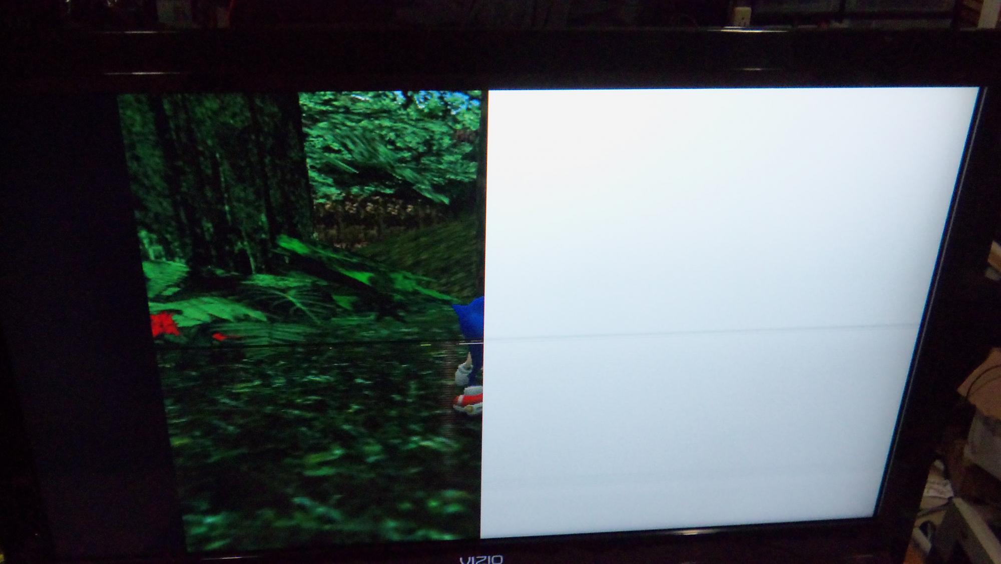 The first 2 pictures are with the right T-con's ribbon cable disconnected-The left side is perfectly fine, except for the vertical and horizontal lines (this time they're alot fainter on the blank white side with the horizontal line being completely white but still visible).