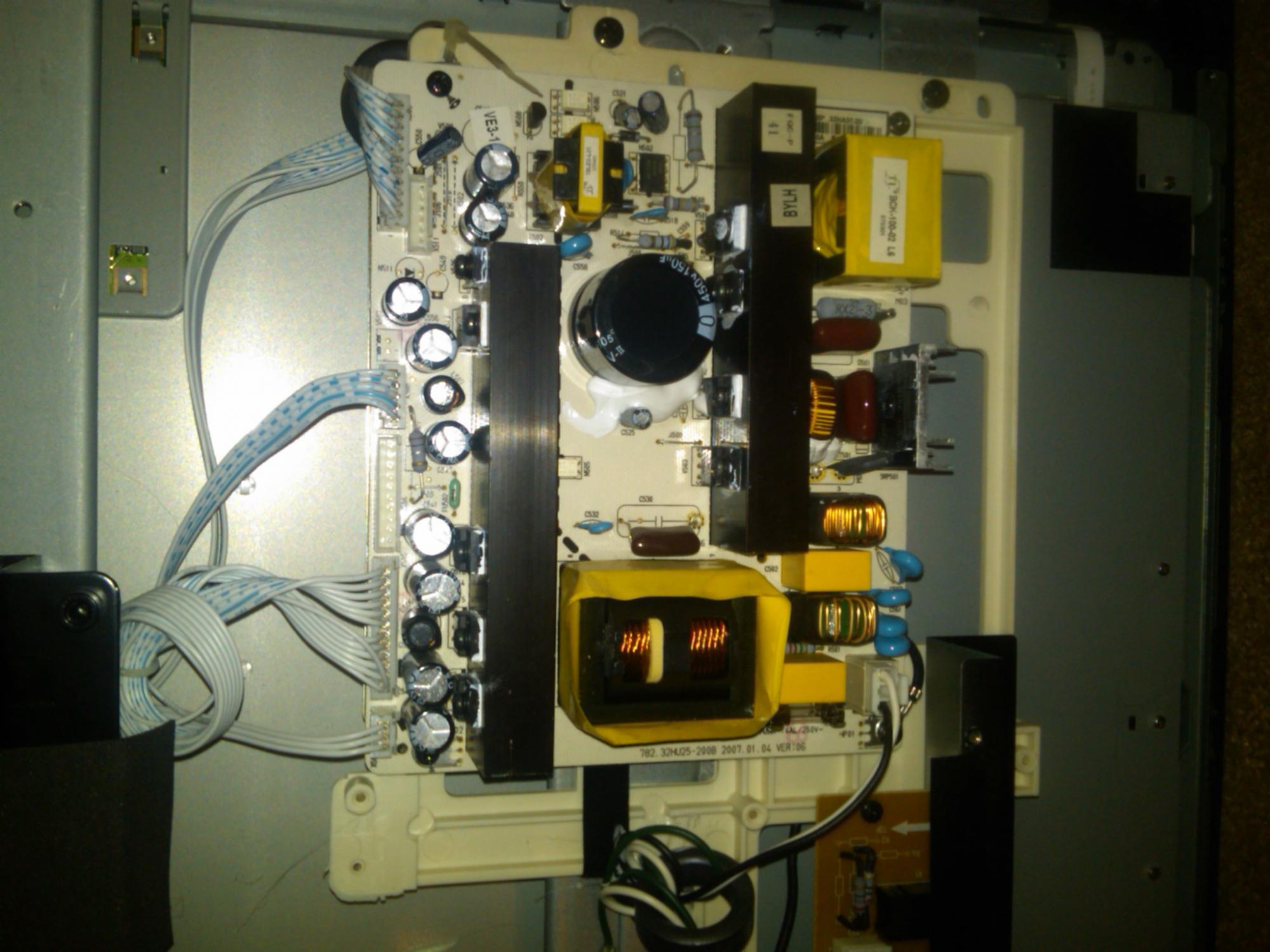 Also of note, the Power Supply board has no noticeable bulged caps. They are almost all "JH" brand. However, the board emits a high pitched, slightly varied squeal when powered on. When the TV is powered off, the squeal gets higher, drops down, and comes back up, in a repeating cycle. (Think of a racecar engine revving and shifting.) It sounds like it is coming from the large 450V cap, but I cannot tell for sure. Again, no capacitors appear bulged.