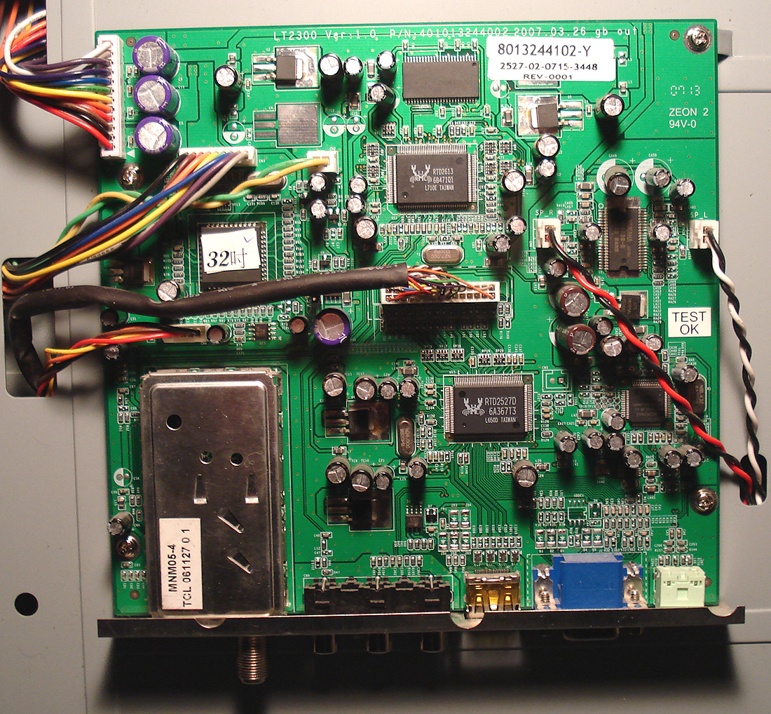 Turns on nicely to a bright blue screen, menu works but seems a little snowy compared to the background blue. In all viewing modes though the image is incomplete as though it's not getting all of the necessary info ( similar to a computer screen set to the lowest possible settings with a limited color palette). Both the main and power boards look good with no bulging caps or burns. I haven't gotten down to t-con board yet. One reading on the PSU rail to the main board is 4.4 V(red wire) -seems odd.