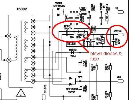 In the first shot you'll see a small 125V 3A fuse (green) directly next to one of the diodes. I saw it there, too lazy (and slack) to test it whilst I was poking around with the diodes. Since it fired up I thought the job was done until the no sound.