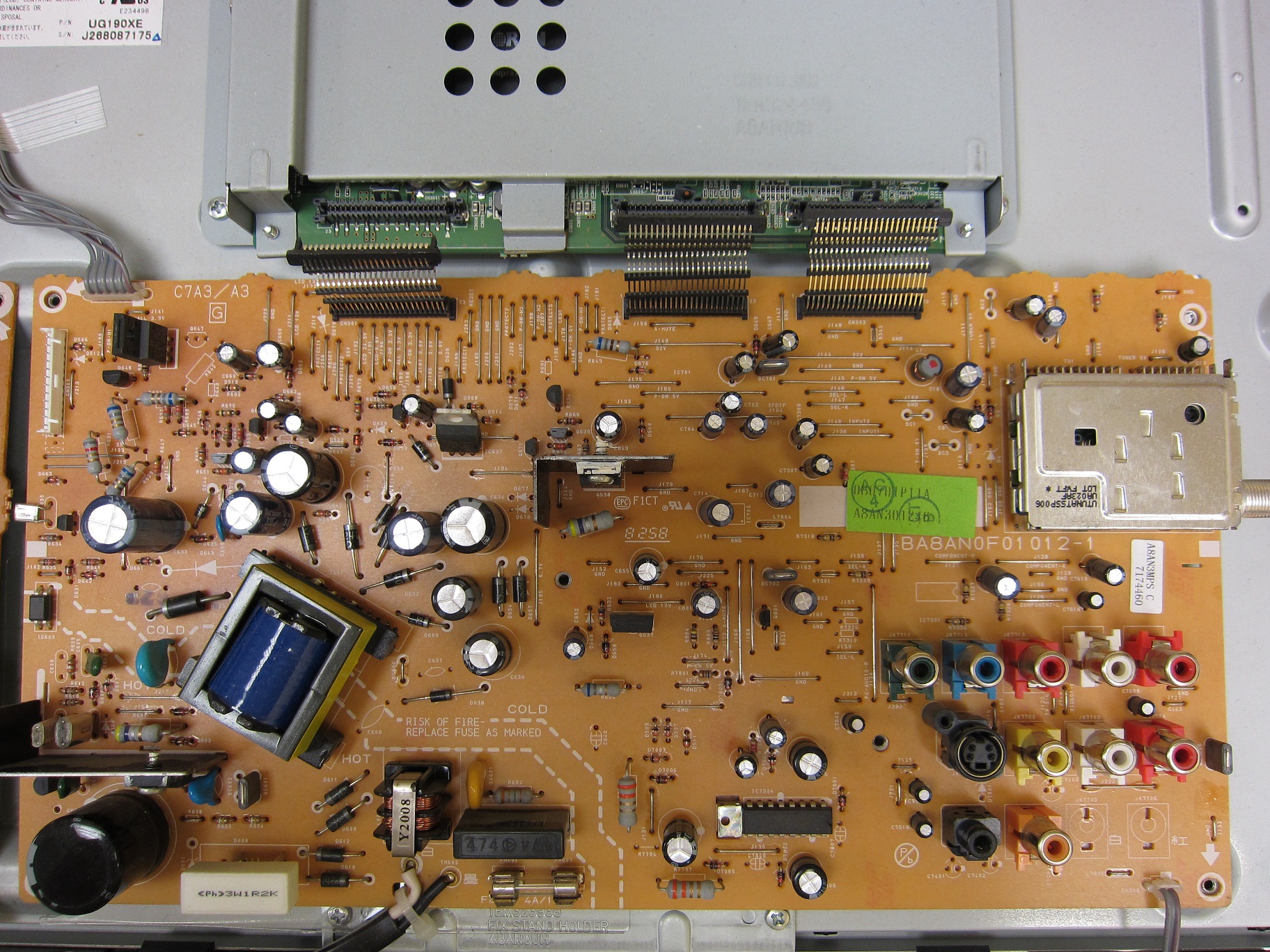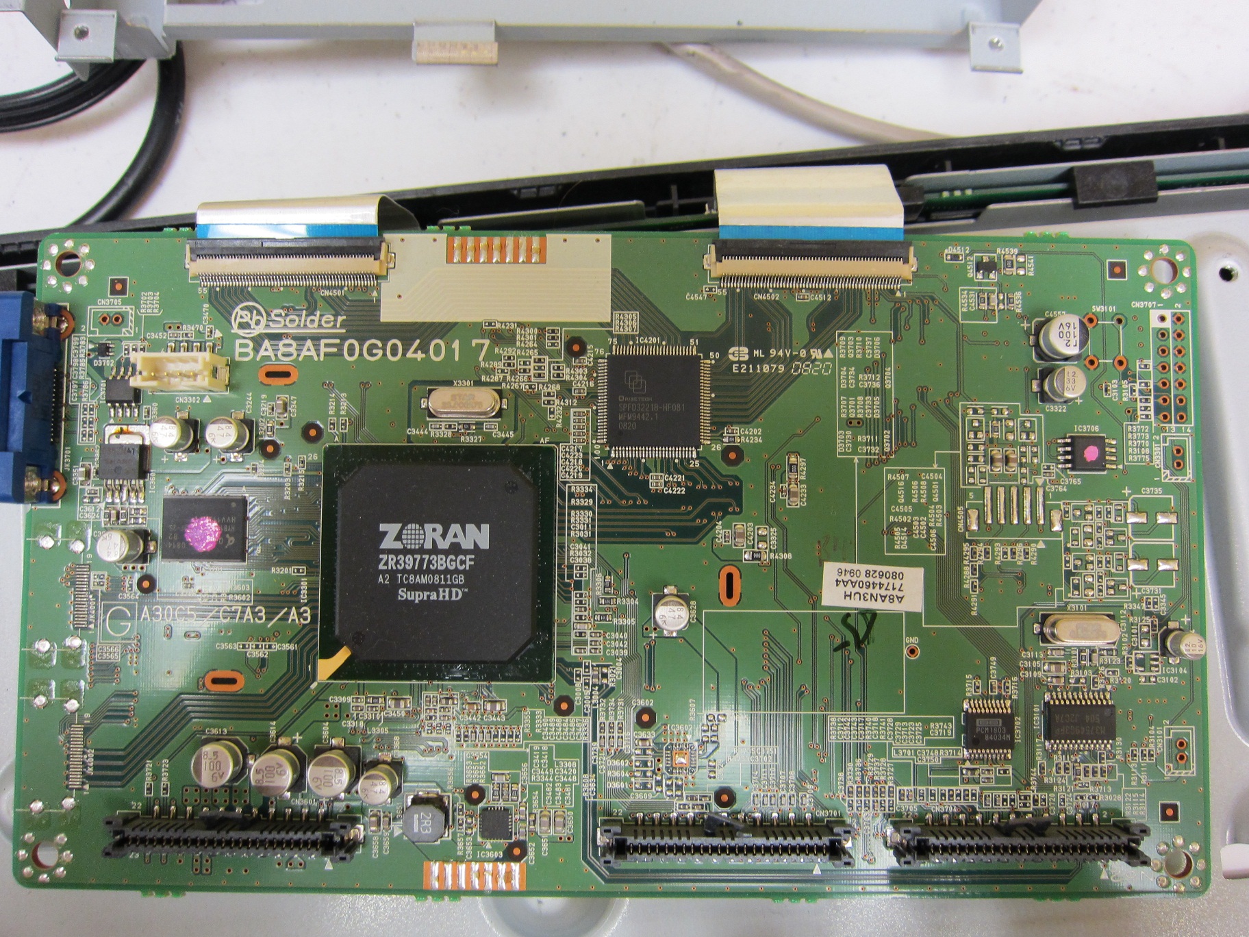 Emerson lc195em9 2 Lcd tv w/vga input. Power light comes on then immediately starts fast blink on and off. Lcd panel does not show any backlight/video. Examined all caps and tested with esr meter, all within tollerances.