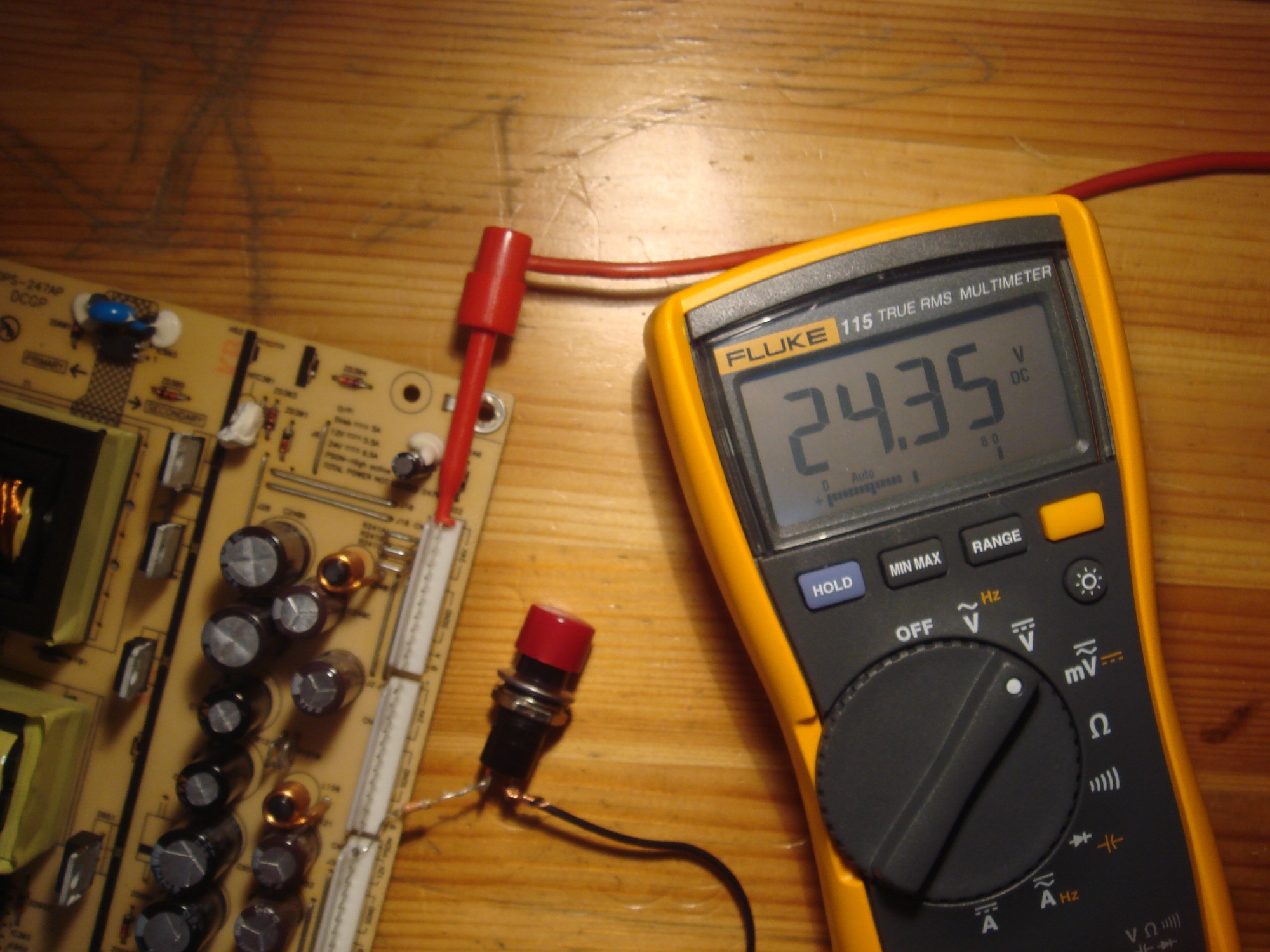 The first thing I did after I took the back of the TV off was to look for obviously bloated/damaged capacitors, but none were readily apparent. I then used my multimeter to test the voltages the power supply board was giving off. The connector to the main board was correctly giving off 5v at 3 of the pins, but the 12v pins were reading 0v. The 24v pins going to the inverter board were also giving off 0v.