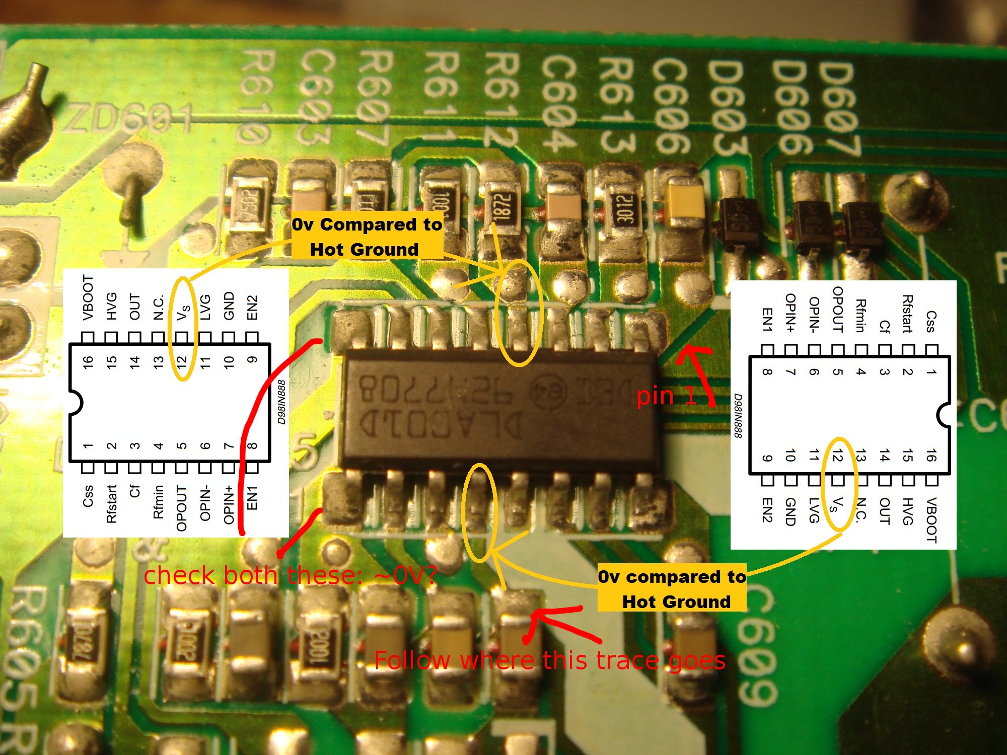 The HOT ground was connected to the various heat-sinks on the high voltage side of the board (this is the first time I have encountered this term "HOT ground", but from what I read - it is a separate ground used as the common on the HV side of the board, with the purpose of further isolating the primary side from everything else. Is this correct?).