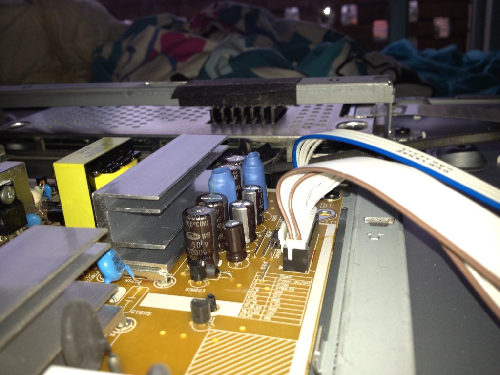 I tried to open the TV set to check for popped resistors but apparently everything was fine; anyways, I replaced all (but the small one) capacitors shown in the picture with new ones, to no avail.