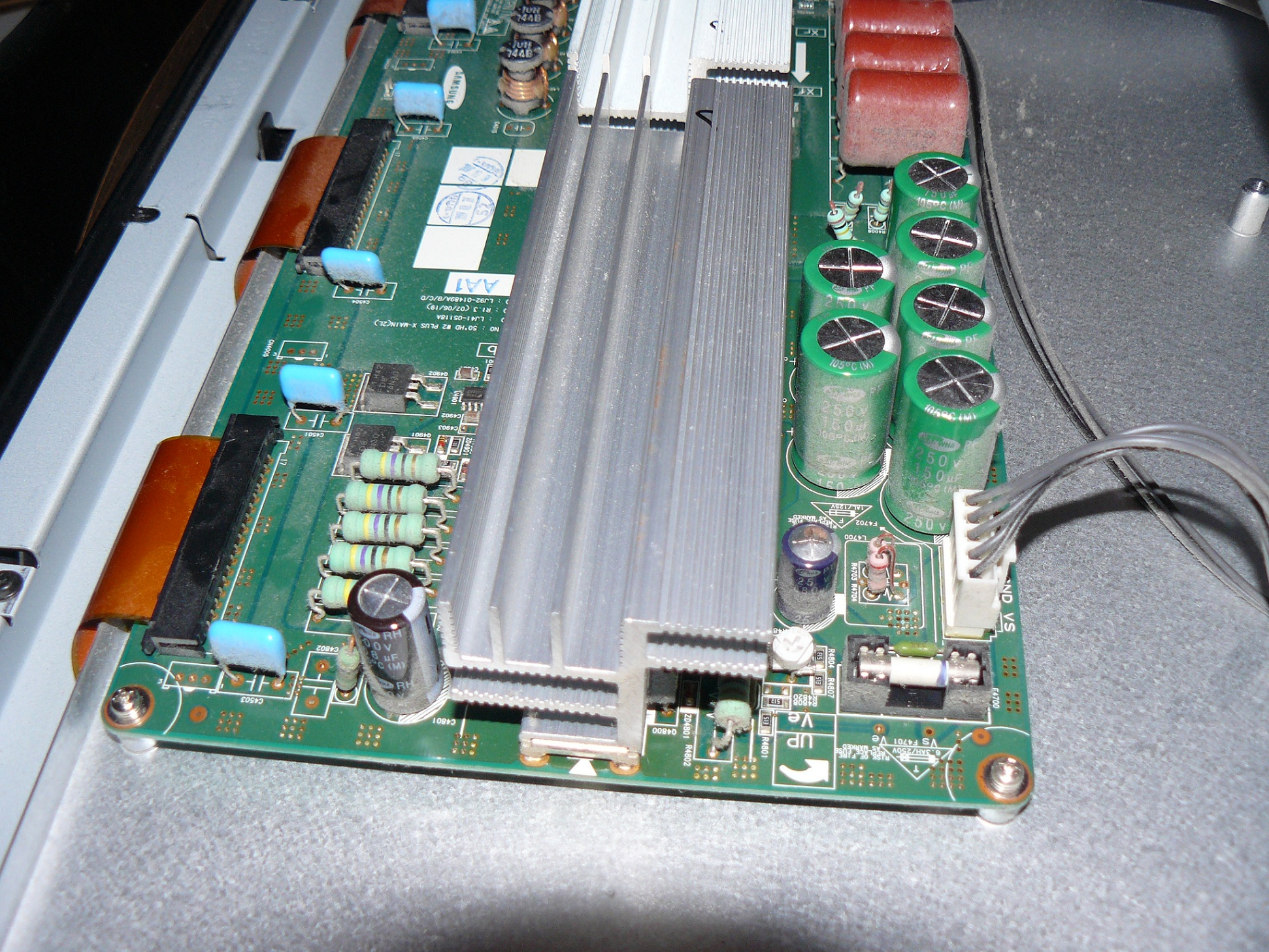 I got a Philips Plasma 50PFP5332D/37 tv. The power supply had several bloated caps. I re-capped the entire power board with panasonic FM & FC capacitors. Put it all back together and the tv fired right up. I played with it for 30 minutes or so then turned it off. 2 days later i go to turn it back on and i wasn't getting any display. The blue LED lights up on the front but no picture or sound. Took the back off and now a cap on the either x-sustain or y-sustain is bloated.