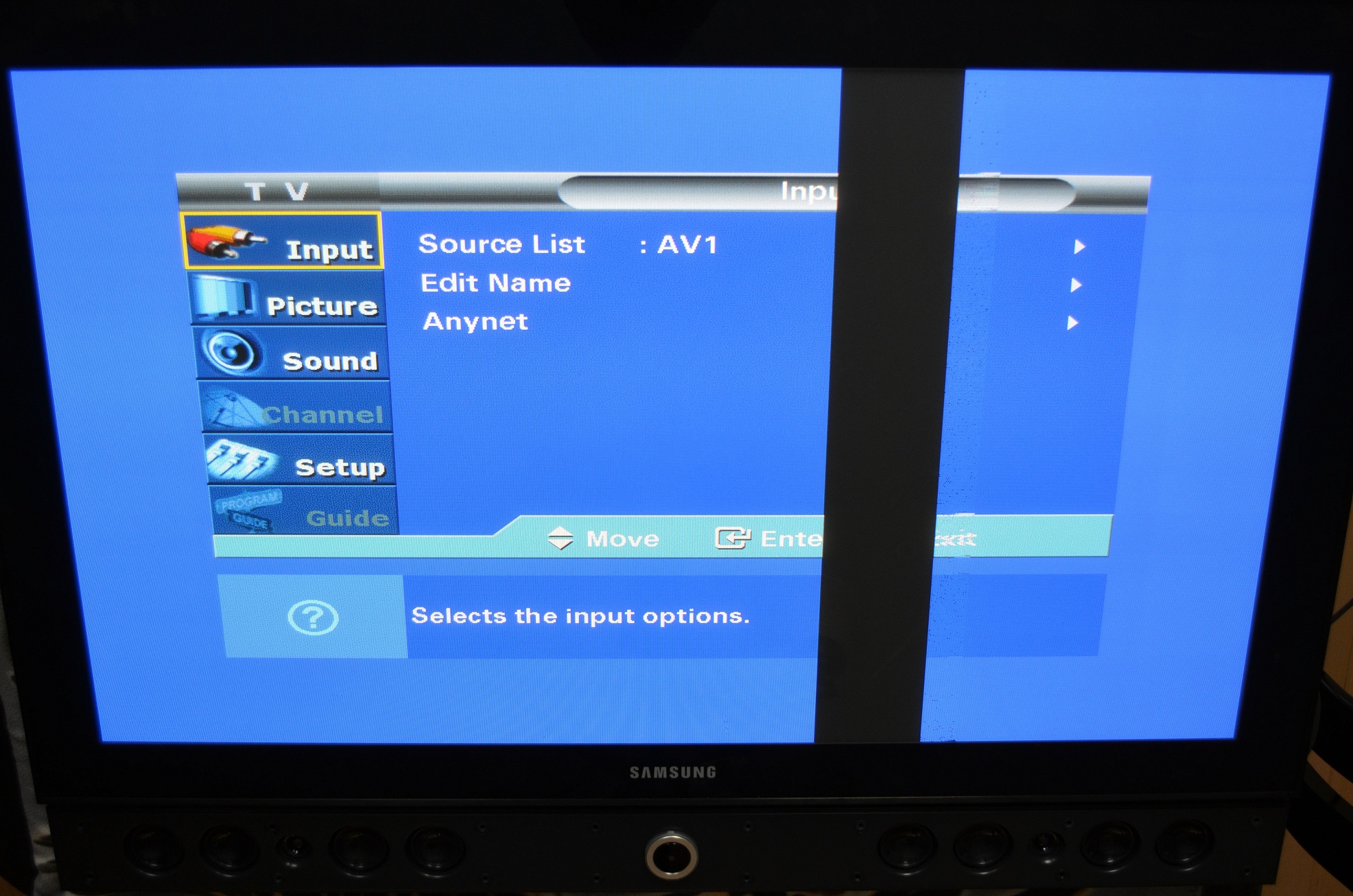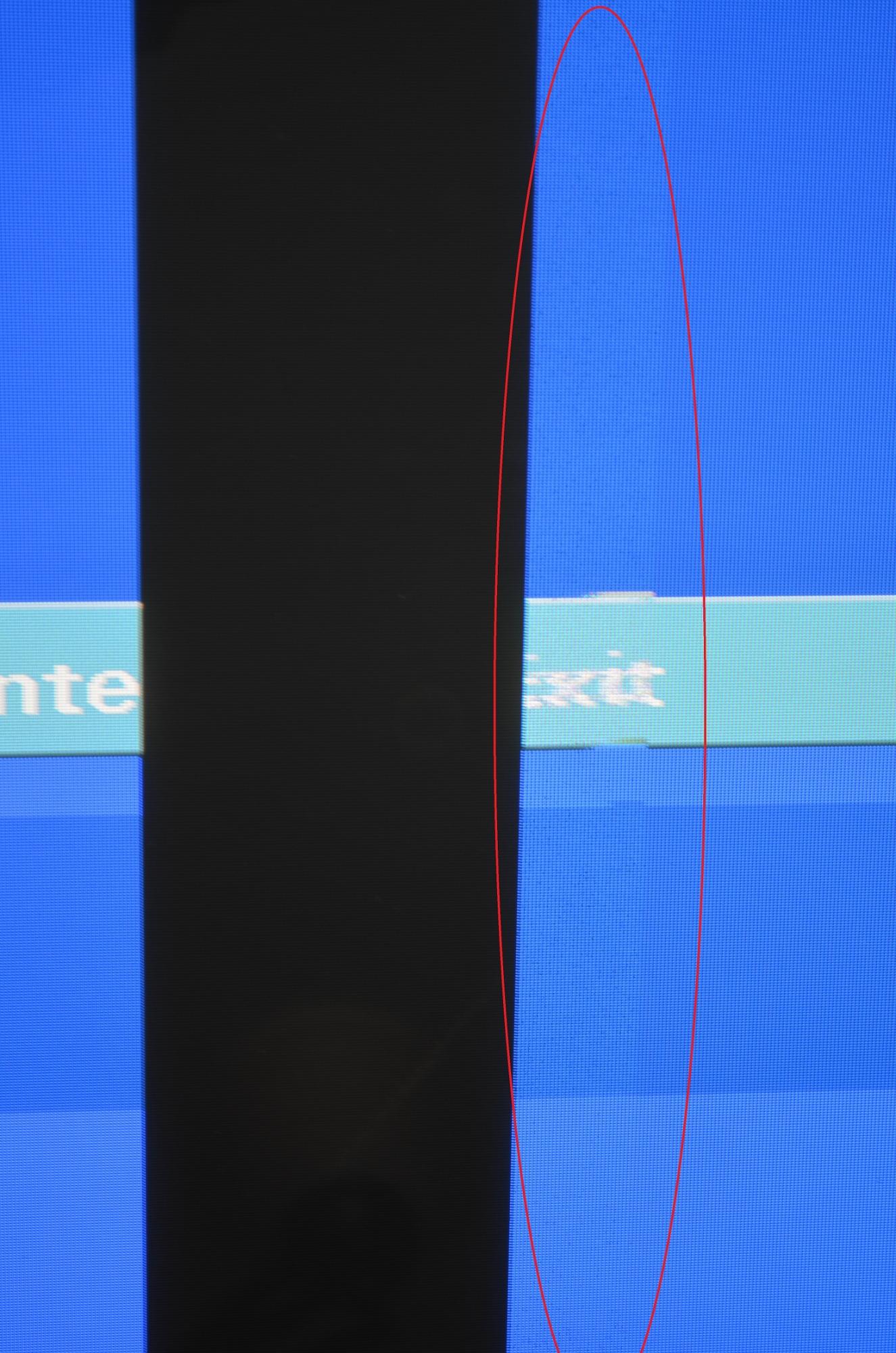 The symptoms is, when showing a picture of bright (mostly white) intensity (within the affected area only) a vertical strip 2 3/4" wide will begin to fuzz out (just to the right of samsung logo, 16 3/8" from screen edge), and soon turns black (from top to bottom). Changing to a darker scene immediatley ater will cause the black stripe to fade back in (it fuzzes and clears up again) and it starts working just fine....