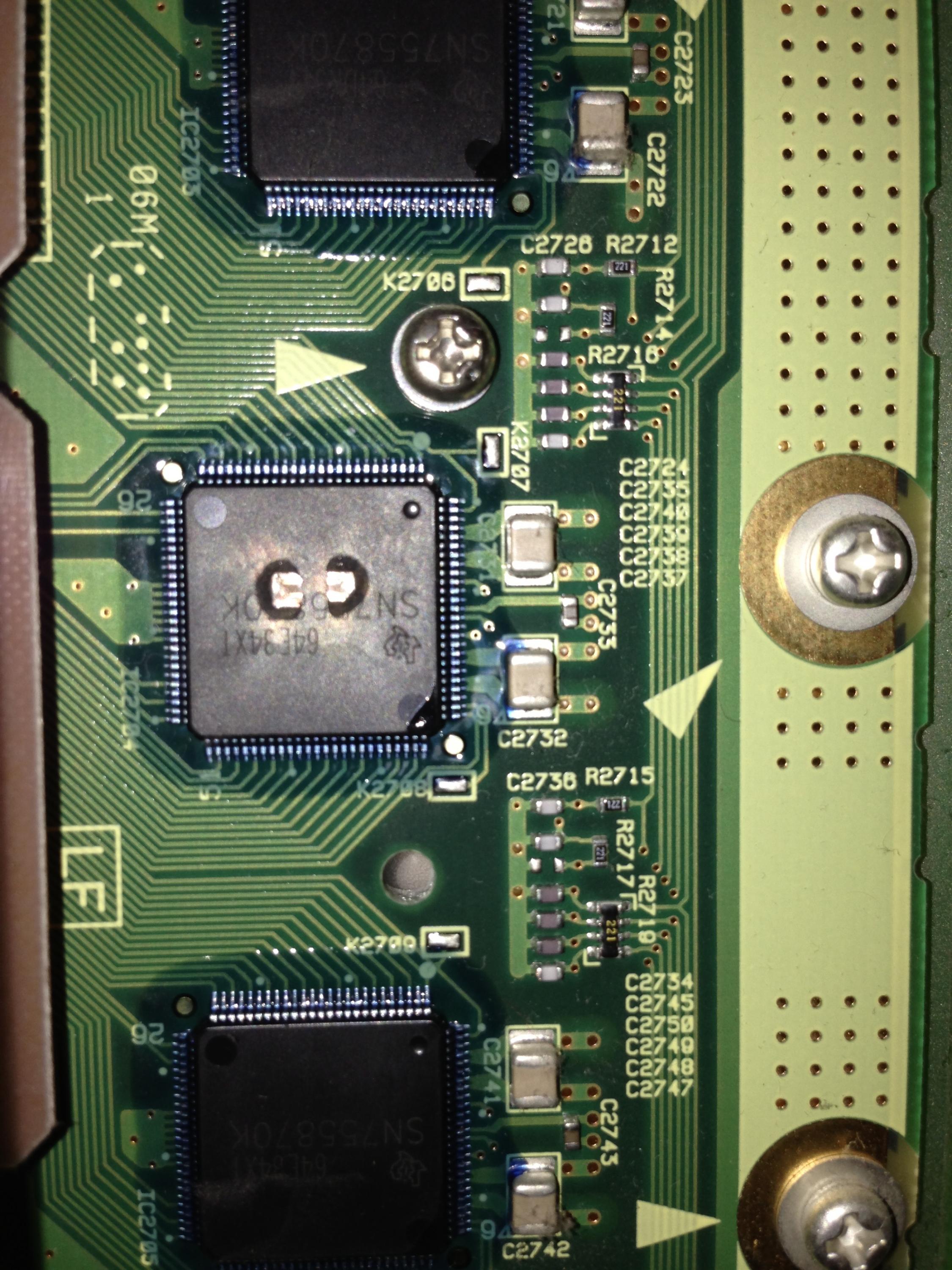 Well the problem got worse today. The TV powered down and won't come on fully anymore. Turns on and powers off at the point when the picture normally comes on. So I took it off its base and opened it up in preparation for the part swap. I think I may have found the bad IC on the scan board (see Photo). I'm still up in the air on changing both boards at the same time or one at a time. Could the drive board cause the problem with the scan board?
