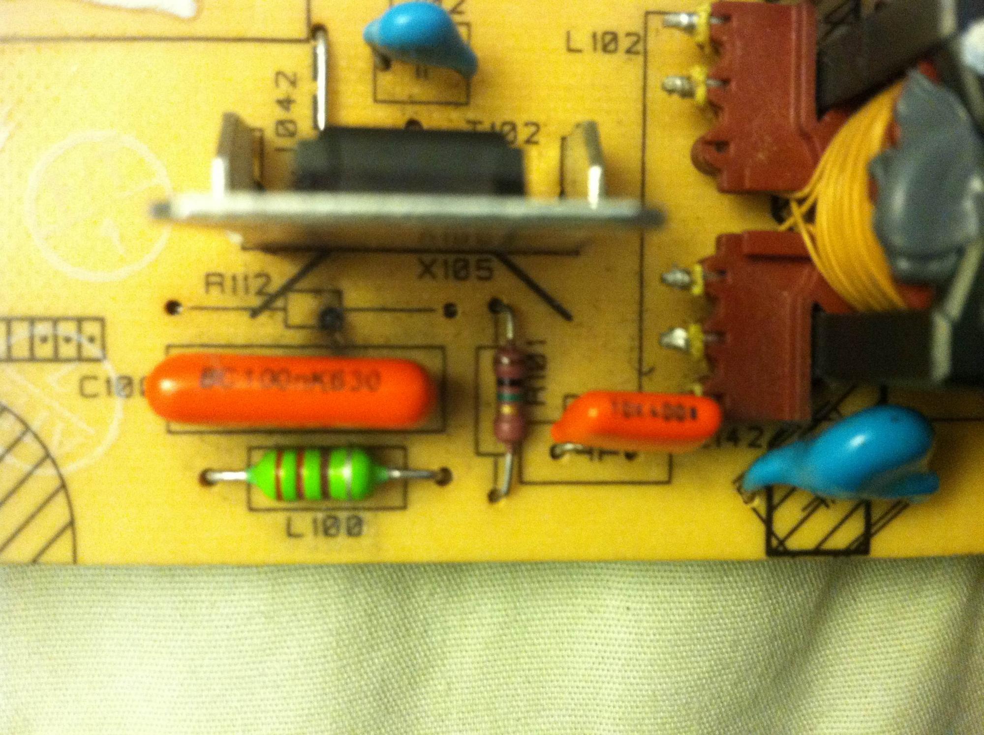 It is hard to tell, but I'm looking for your power mosfet. It is usually a 3 pin IC. It might be the IC just left of L066 mounted on the heatsink that says Danger?