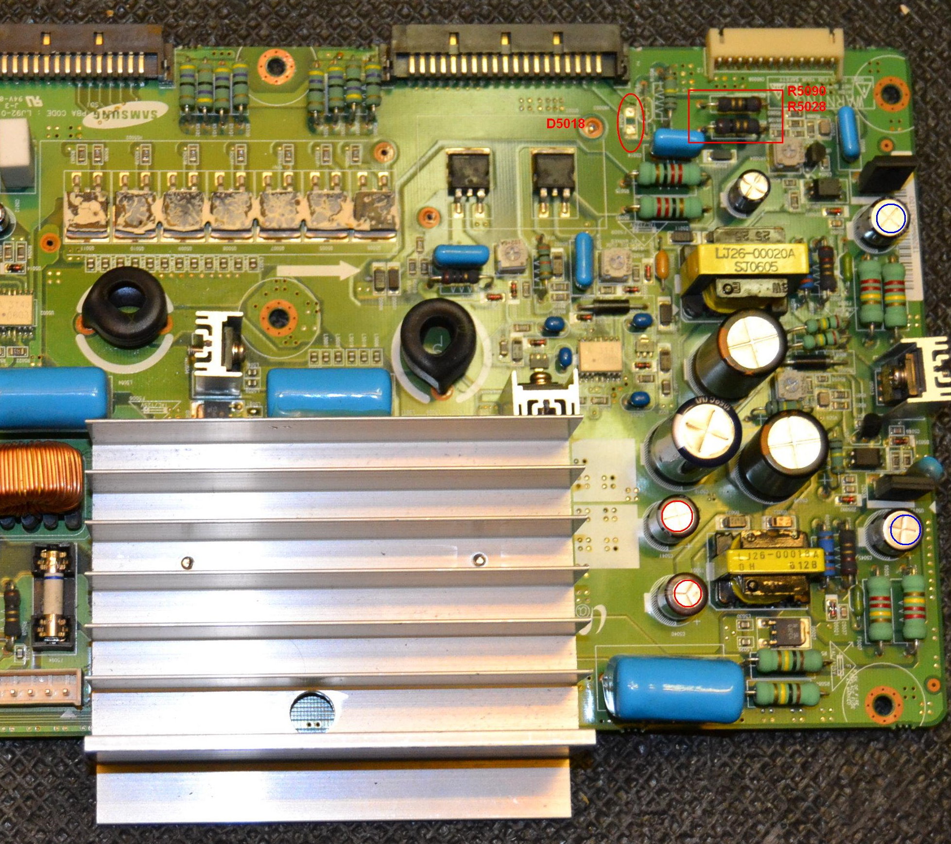 When samsung lj41-02761 buffers short *check d5018 d5009 resistors r5090 and r5028 on lj92-01200a ysus board along with mosfets under heat sync.*Also sometimes if sustain pulses like a cycling effect check D5022 near small transformer.******Leave a comment:
