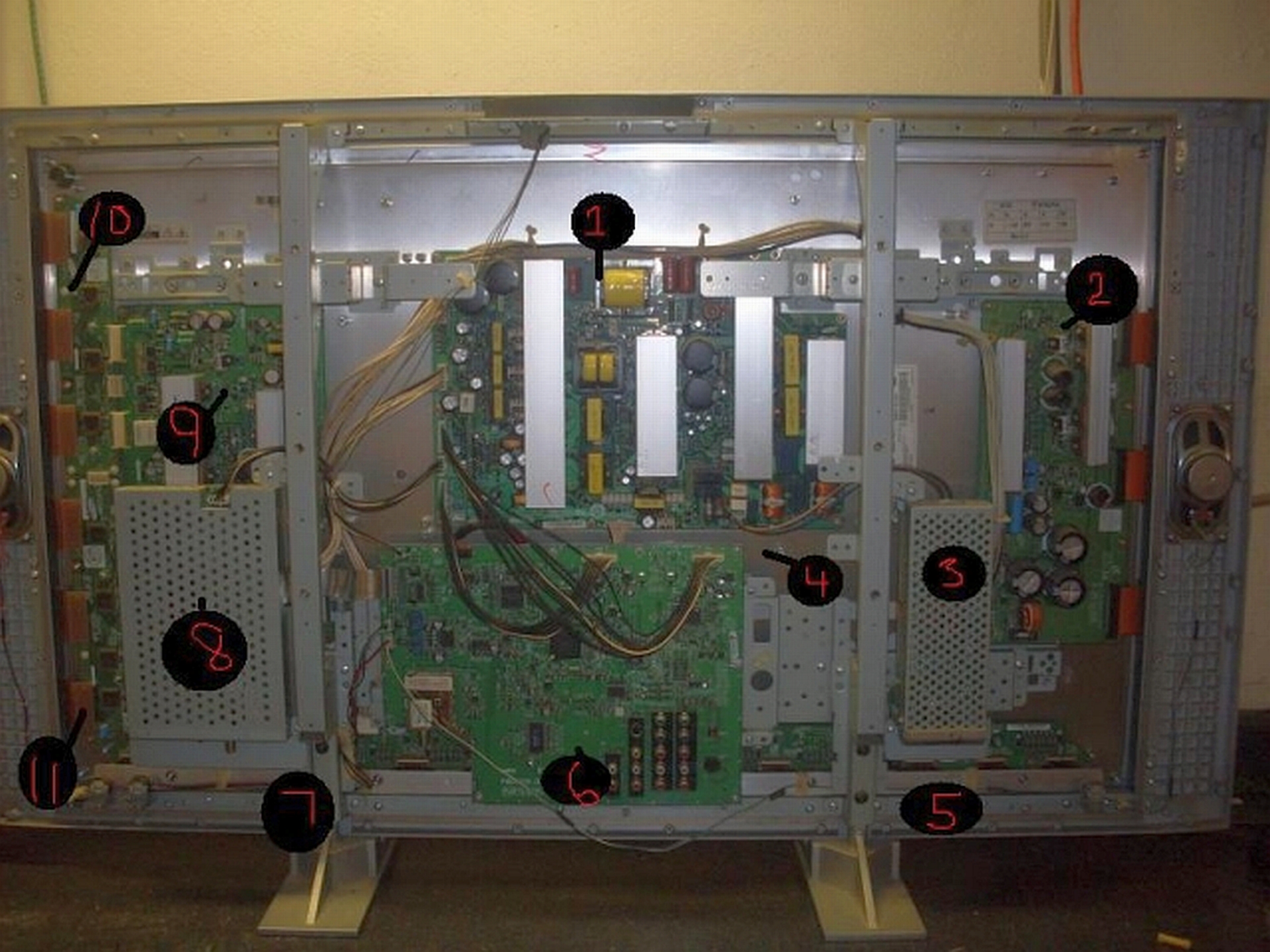 First check would be PSU output voltages, including plasma panel voltages (Vs and Va, or whatever they are called on this set.) If those are present, check fuses. Post a closer picture of the PSU if you're unsure where to probe.