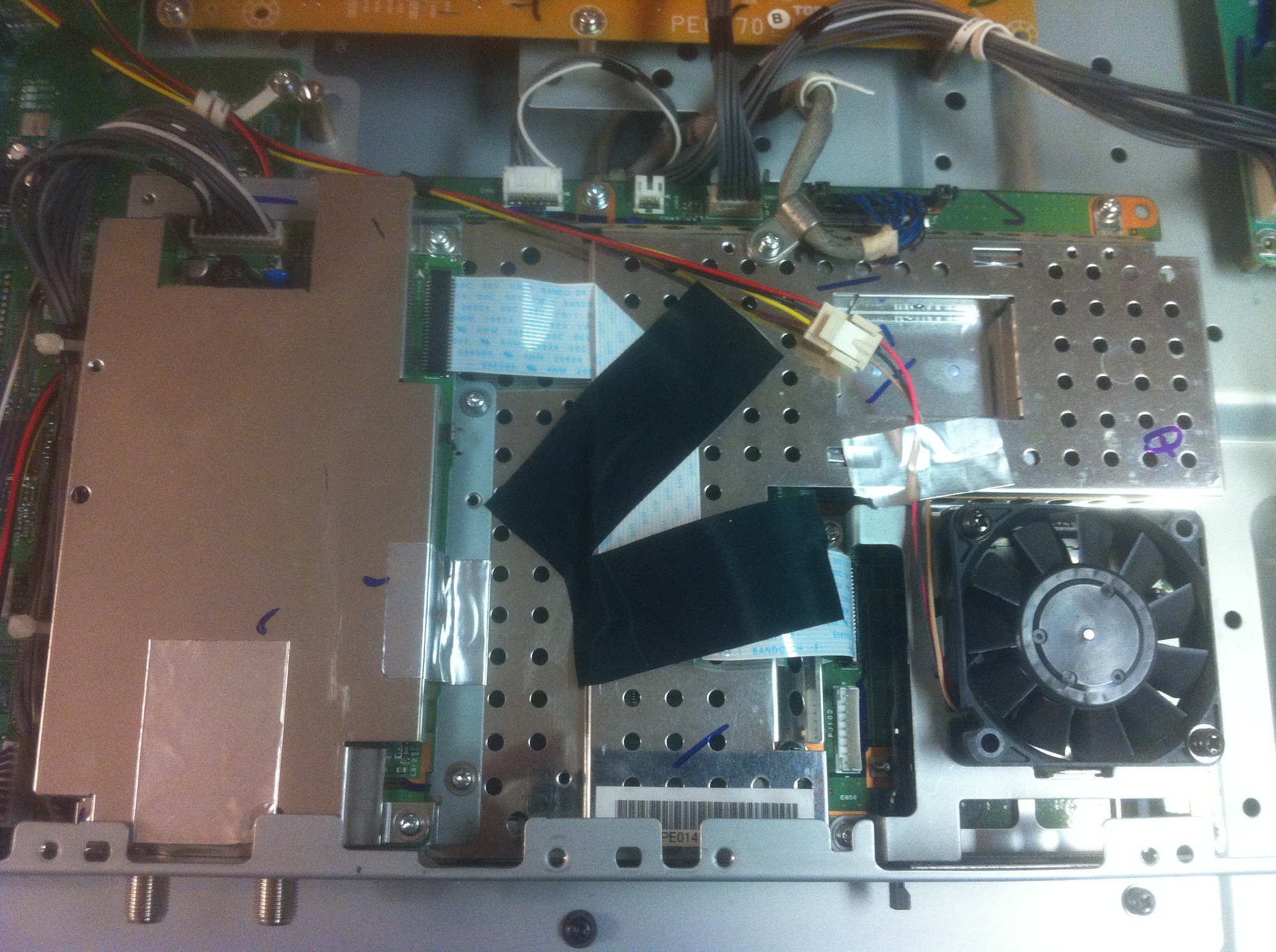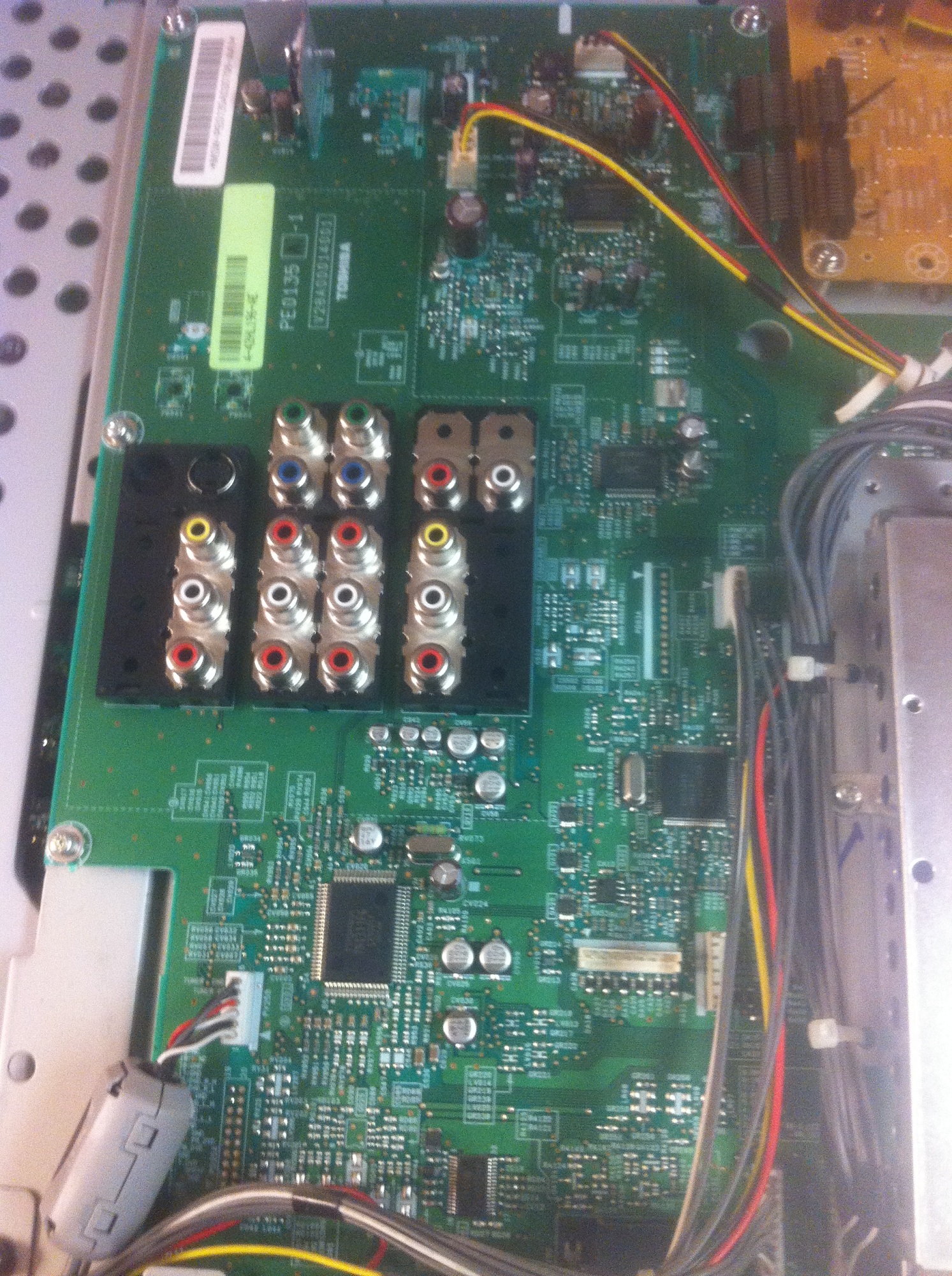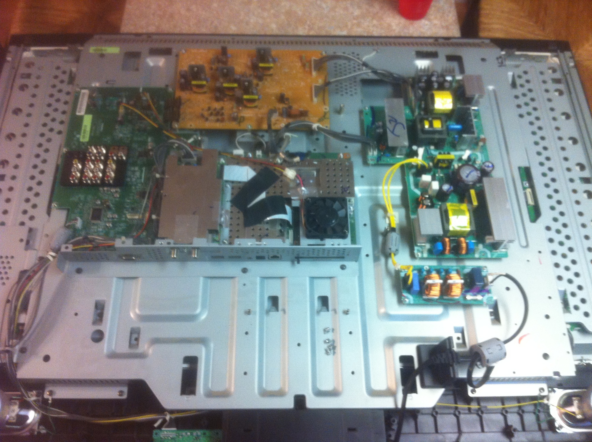 I picked up this 42" toshiba LCD the other day and i'm getting around to checking it out. When the power button is pushed I'm getting 3 red flashes from the front led, then a pause and 3 more flashes. Checked under the hood and just shook my head, crap load of ugly boards inside this bugger. Either way. I checked my PS rails and i'm only getting the 5V stdby voltage. The ps_on pin isn't picking up a voltage. Typically I would look at the main board next but this one is different. It is loaded with different boards. It has the PS board, a "Lower B" board(someone please tell me what this is for, located in middle of tv with brown PCB), Seine (Main/Logic) board and another input board on the left side of tv.