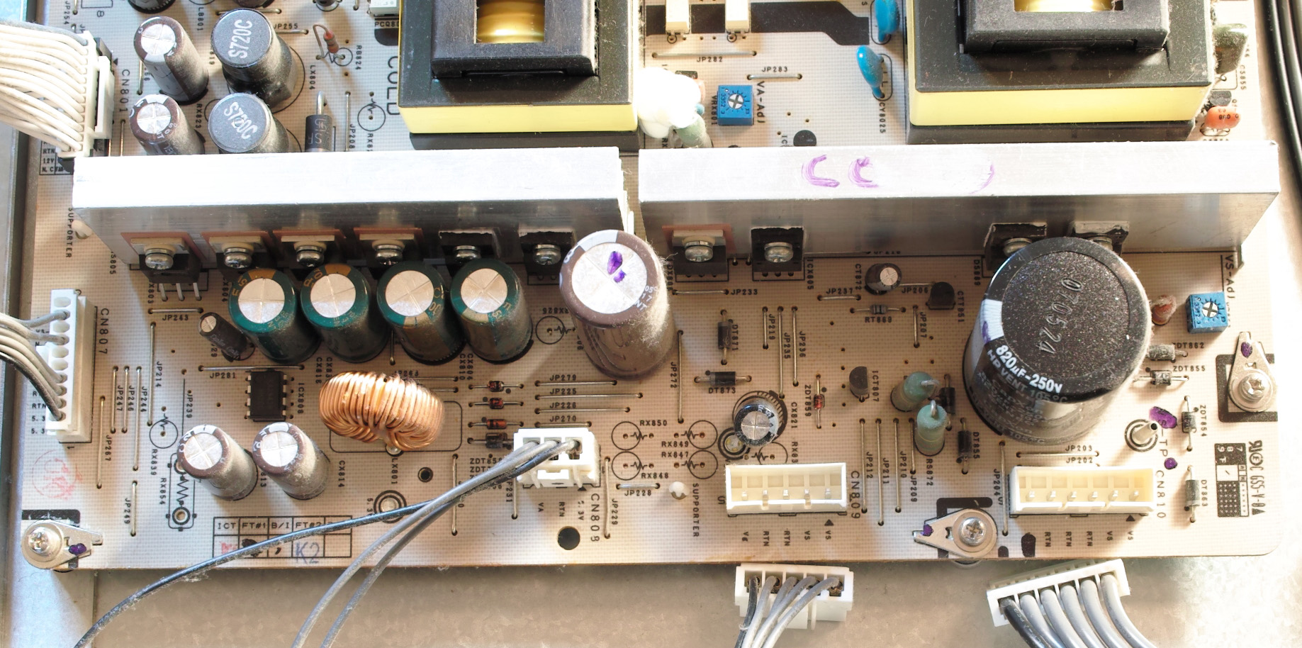 Since I found this TV had already been opened, I'm wondering whether some strange soldering points indicate a previous repair attempt? some components look as if they're missing, or perhaps on the other side. Also the revision date of the x-board seems inconsisten with the other boards. Two of the heat sinks on the Power supply board are cold when operating.