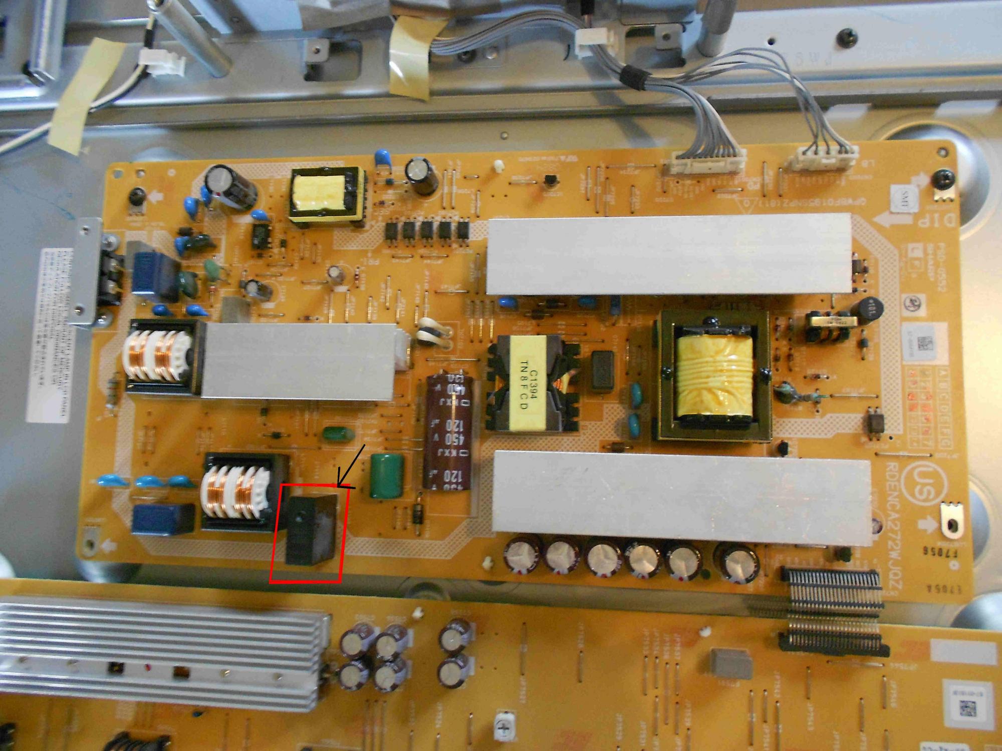 I also noticed that this relay(red box in picture) actually clicks "on" when the TV is first plugged in. At that time I get 37V at pins 1-4 on the 12 pin connector, then after about five seconds, the relay kicks "off" and the voltage to these 4 pins goes to zero volts. This is also when the power and OPC lights begin to flash.