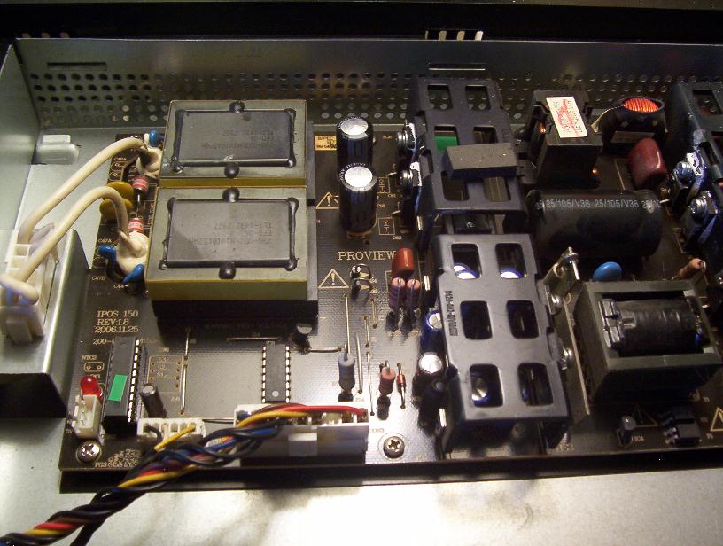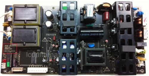 This Memorex 32 inch LCD has a power supply board made by Proview. It is assembly number IPOS 150 Rev 1.8. The screen went dark. Upon examining the board. EC 17 and EC18 (Aluminum Electrolytic capacitors) 10 MF, 450 V, 85*C had bulging tops. Replaced them with Radio Shack (Aluminum Electrolytic caps) LTE,10MF, 450 V, 105 *C. Picture is back and TV is working.