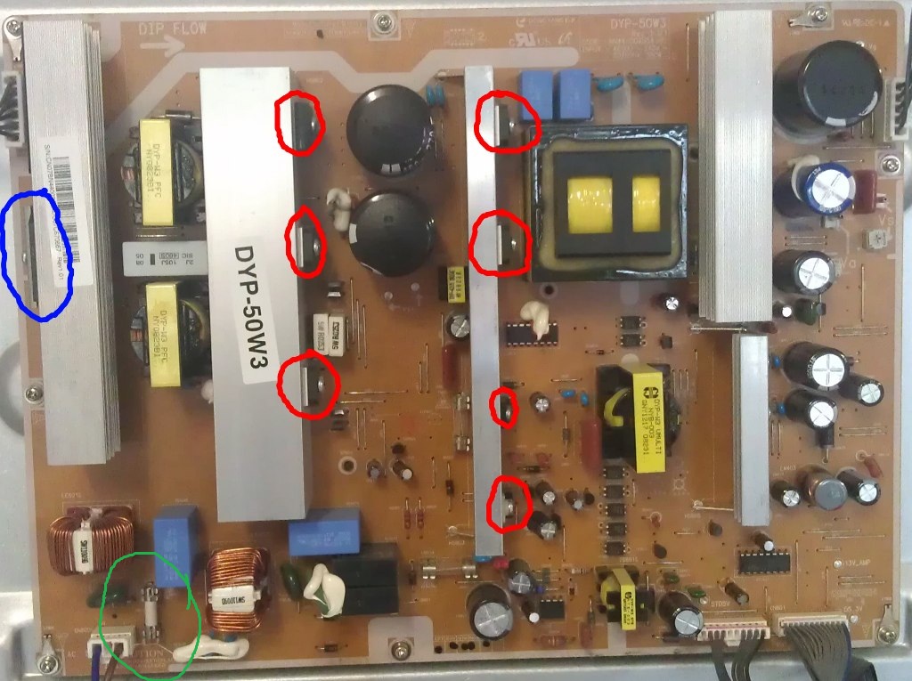 To get to the point I have picked up a Samsung PS50A410C1D. On 1st inspection the main fuse on the power supply is blown and the 2 larger capacitors on the board are clearly fried.