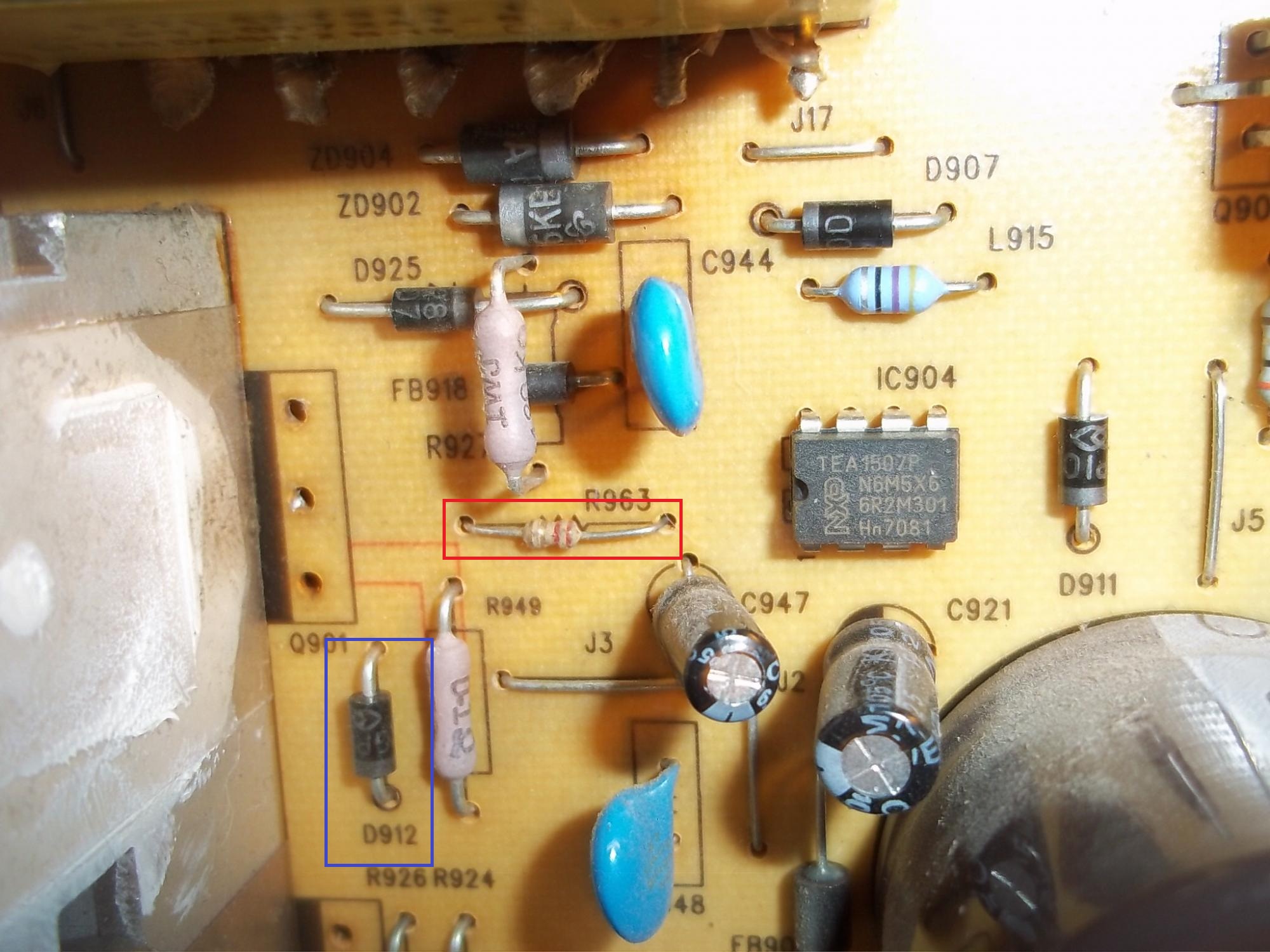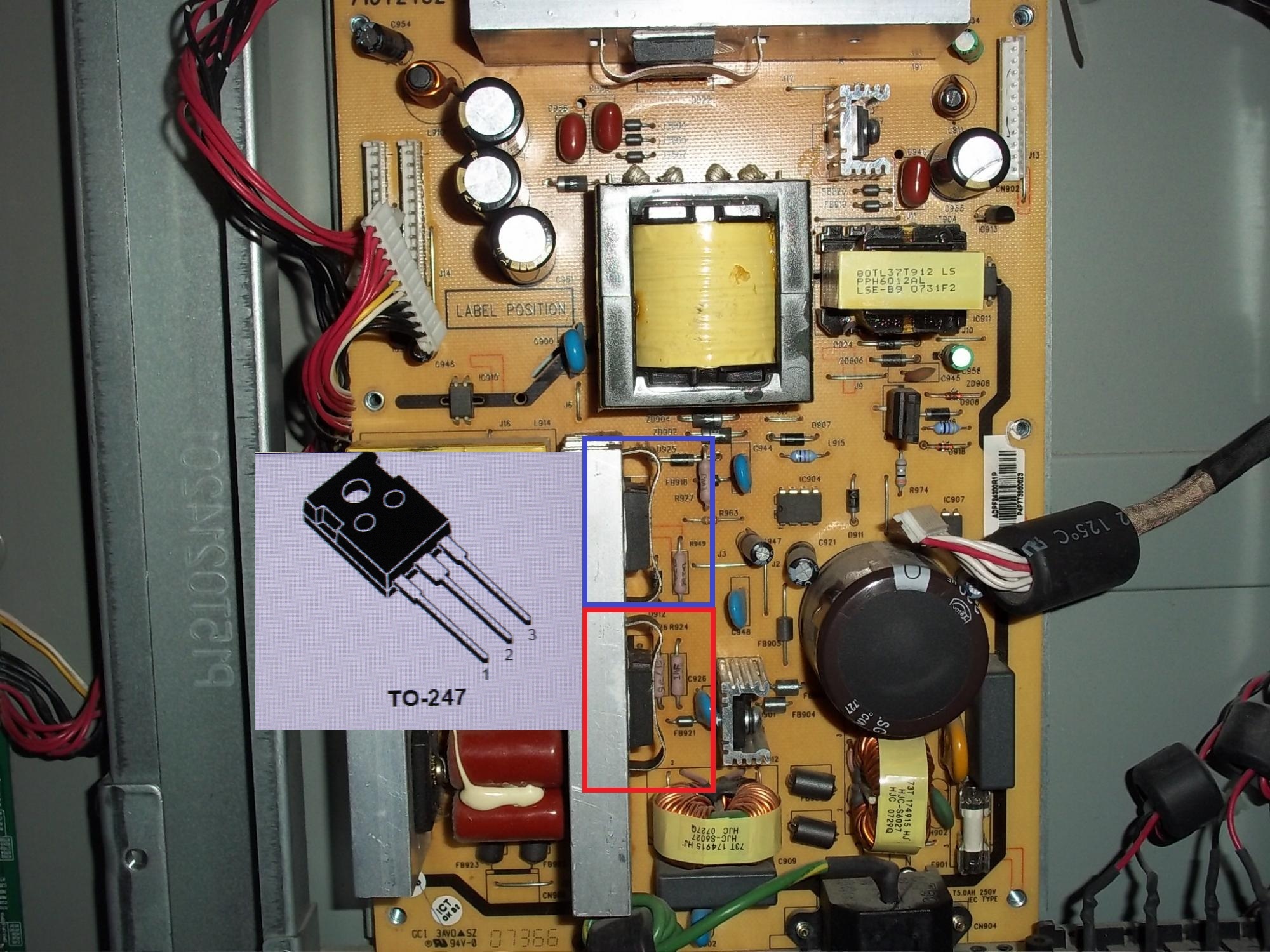 Ok so here is the run down. I have picture but no backlight. I got the tv with a blown fuse. When I put a new fuse in it, it blew resistor R963 (red in first pic). After replacing that I checked some diodes and found 1 bad at D912 (in blue in first pic). Then I tested the mosfets mark in red and blue in second pic and found them bad and replaced them. Now when the tv is on I get picture but no backlight. The other thing is that I only get 1.5v DC at the invertor boards. So I was wondering if you guys think buying a working power supply will fix all problems? I can get 1 for $78 but dont want to waste the money if there is another problem. Please let me know what to check. All of the caps look fine on main and power board.