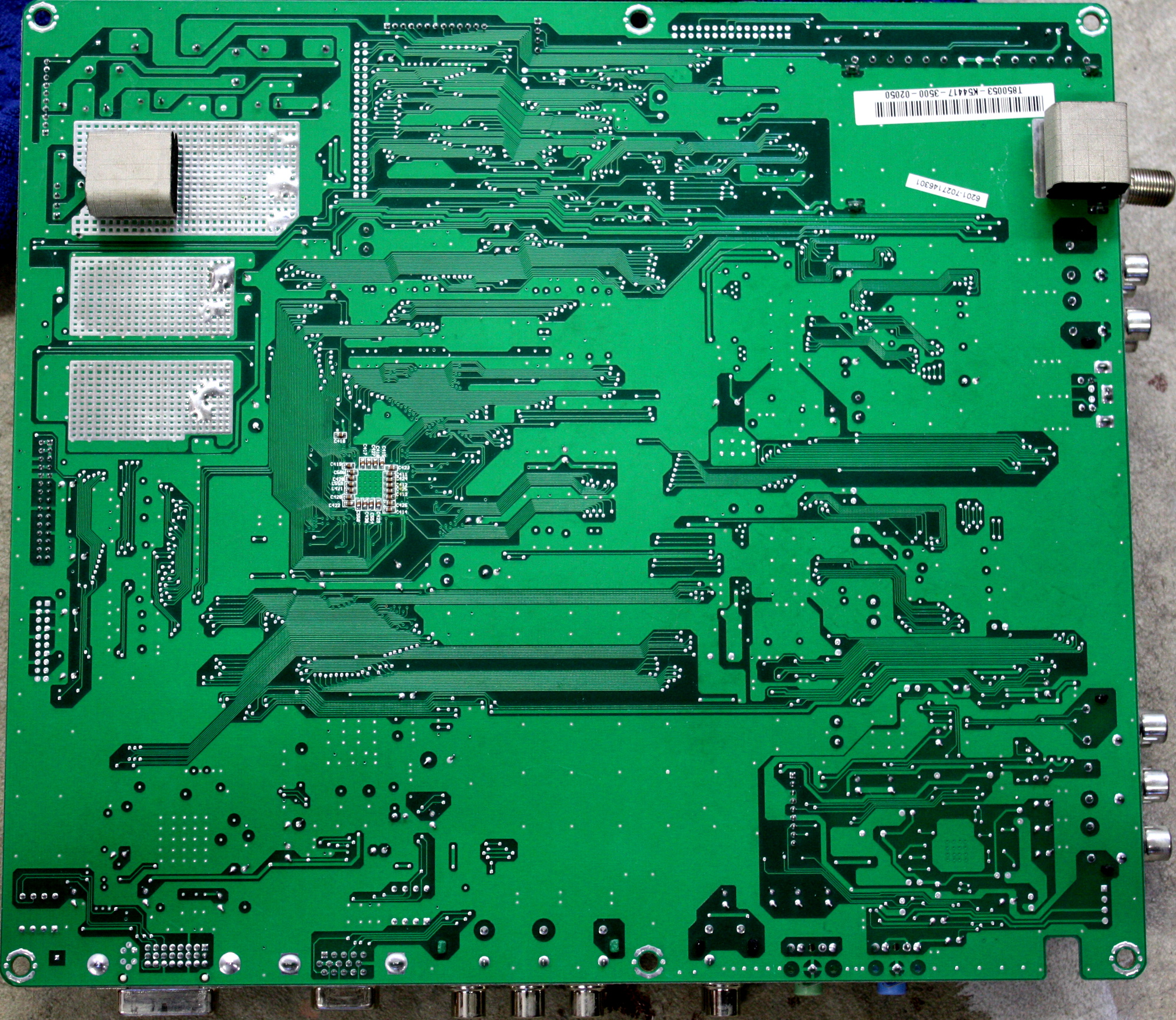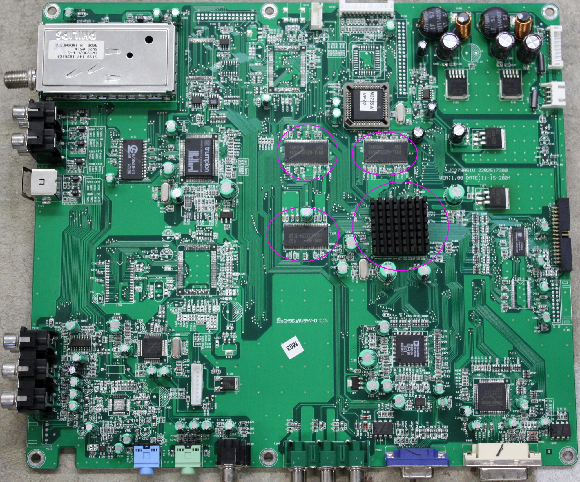 I'm working on a ViewSonic n2750w with this weird image distortion. The best way I can describe it is the image has artifacts, but these artifacts fall into a very uniform grid pattern. But the interesting thing is, if you pull up the TVs on screen display, the OSD is crystal clear with no distortion. I've attached two pictures showing the TV with and without the OSD. I've tried almost every input on this TV; coax, S-Video, composite, VGA, and DVI. The distortion occurs on every input I tried.