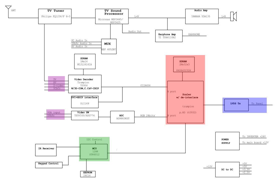 The service manual for this TV included a helpful block diagram on the video board circuitry (also attached). The various inputs (in purple) are not displaying correctly. The OSD comes from the MCU and that's working (marked in green). Also, the LVDS to the panel is fine (blue). So I believe the problem is in the scaler/de-interlacer area of the circuit (red).