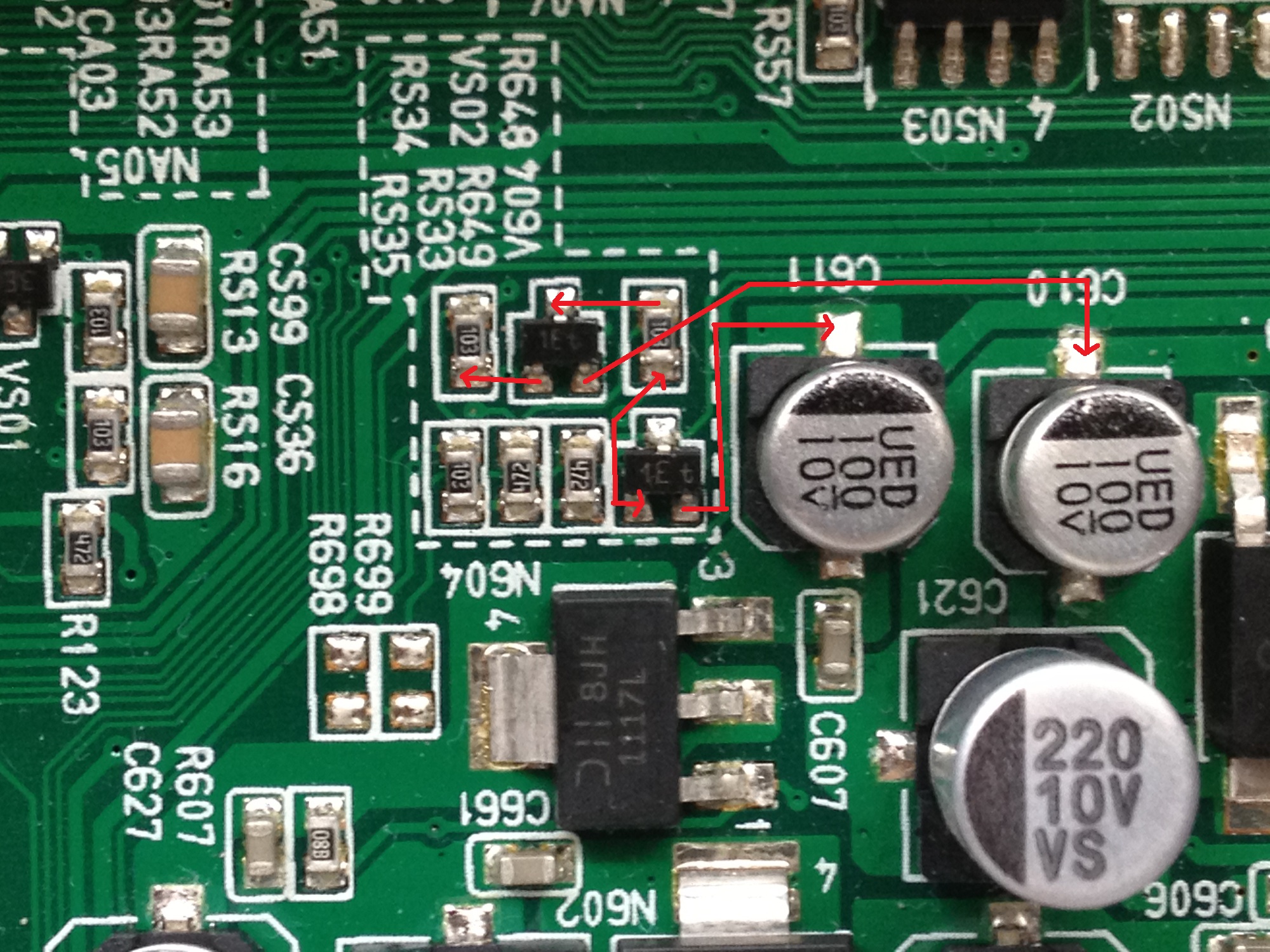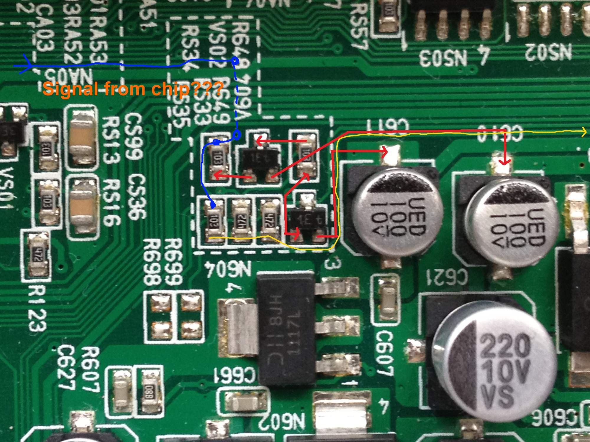 On your picture, the transistor that is circled in red, where do the bottom two pins goto? I think one of them will go to ground. The other I think leads to R684.