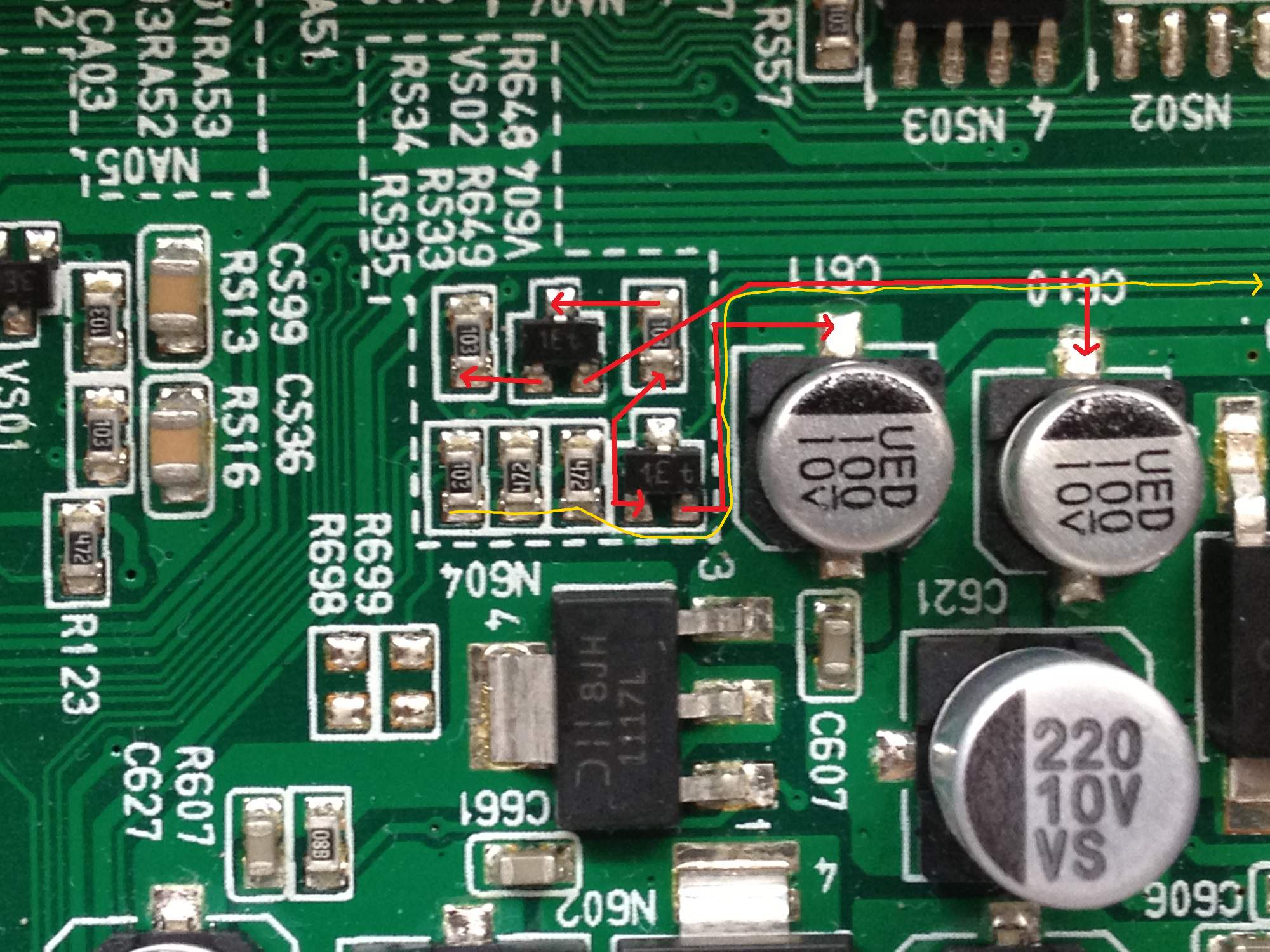So, if im right, this yellow trace should goto a power source? (probably 5vsb)