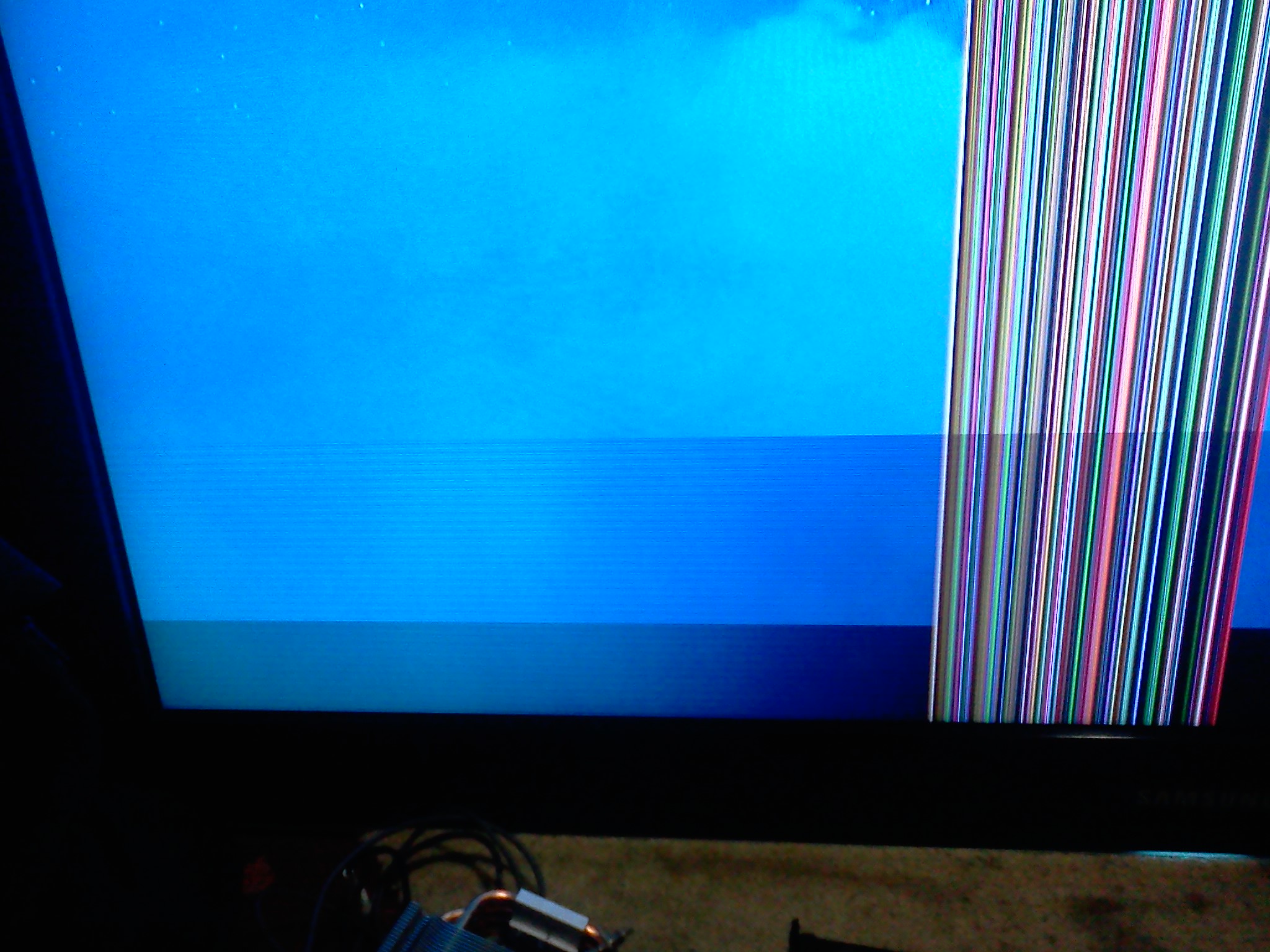Just now my Samsung LC32HG70QQUXEN monitor gave up on me. On cold boots I get many vertical stripes going across the screen (see the attached picture). After it runs for 1-2 minutes those go away but there are horizontal stripes going across the whole screen no matter of the input and PCs I use. (couldn't take an picture of it since the image size goes to 20MB and the camera doesn't pick them up)