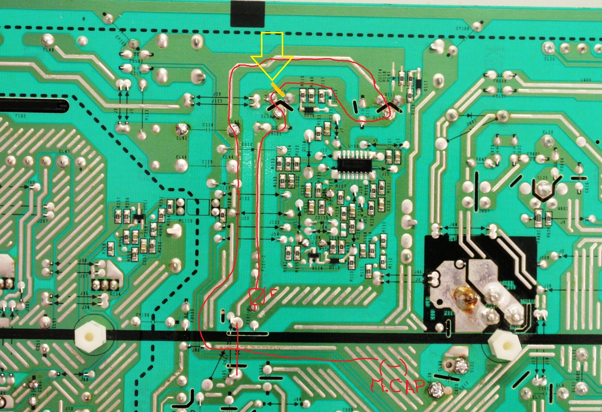 I have removed the little SMD diodes(2x), capacitor(C112) going to pin #16, resistor R117, J29/J123, C114, still no difference.Comment