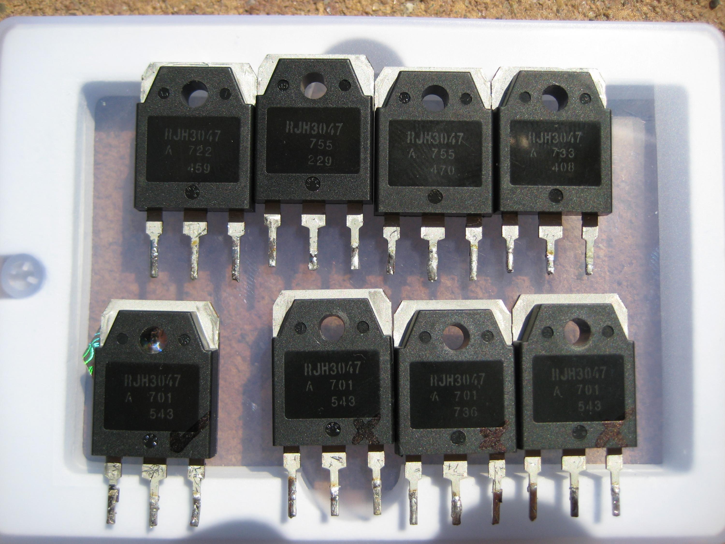 The chirping sound became louder from around the upper heatsink. Being afraid of shorting another set of transistors I tried only few times powering up but I got no luck. Desoldered the components again and checked. At least the transistors and the rectifiers are still OK.