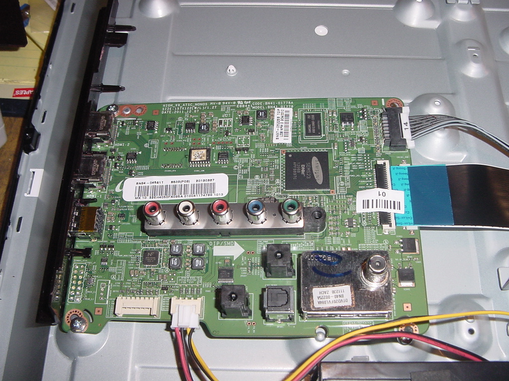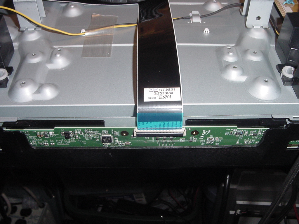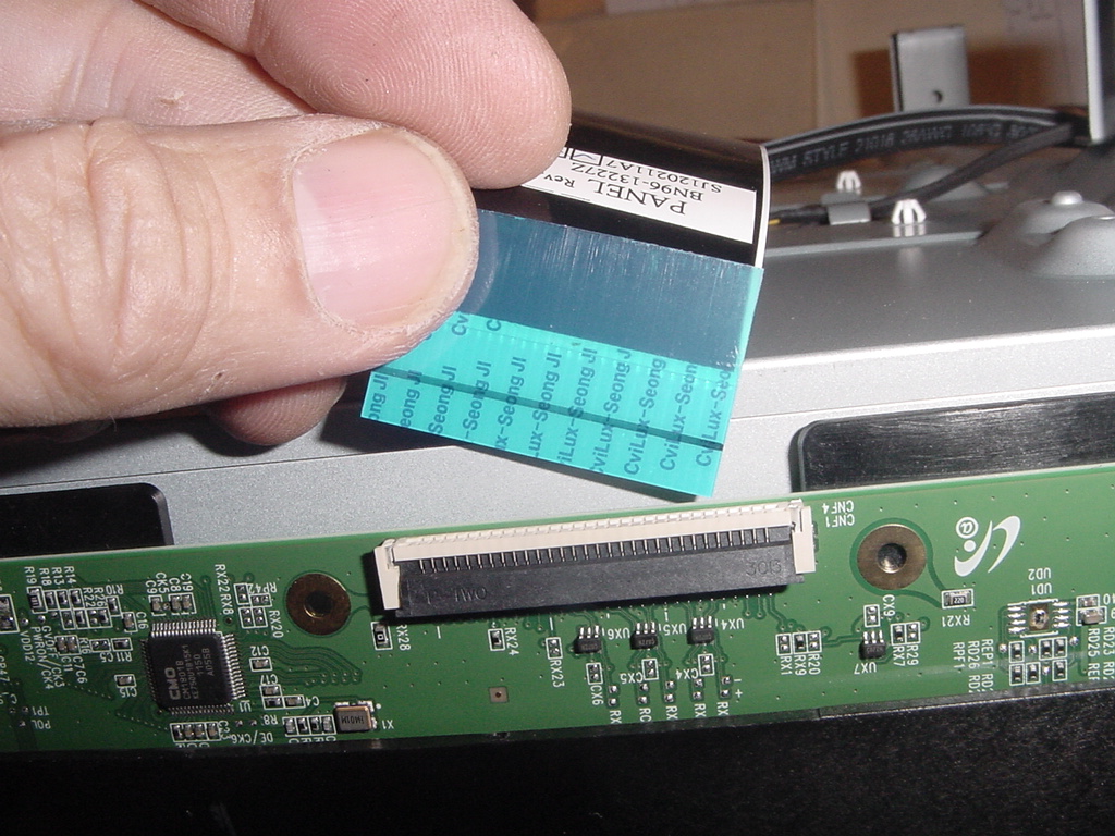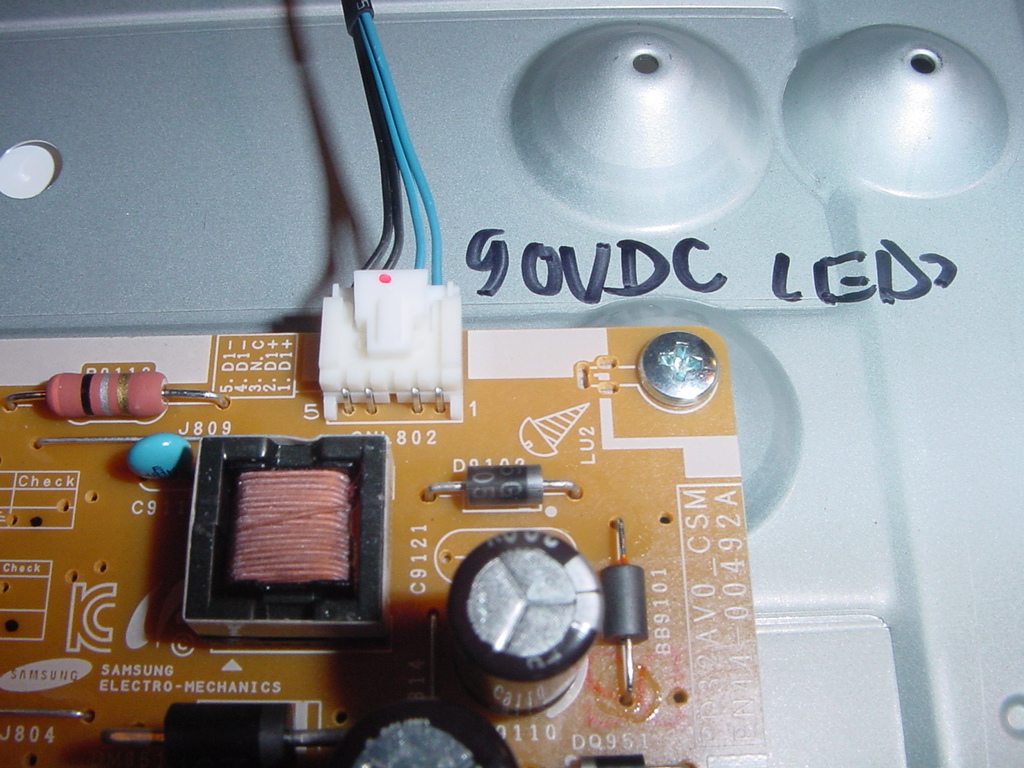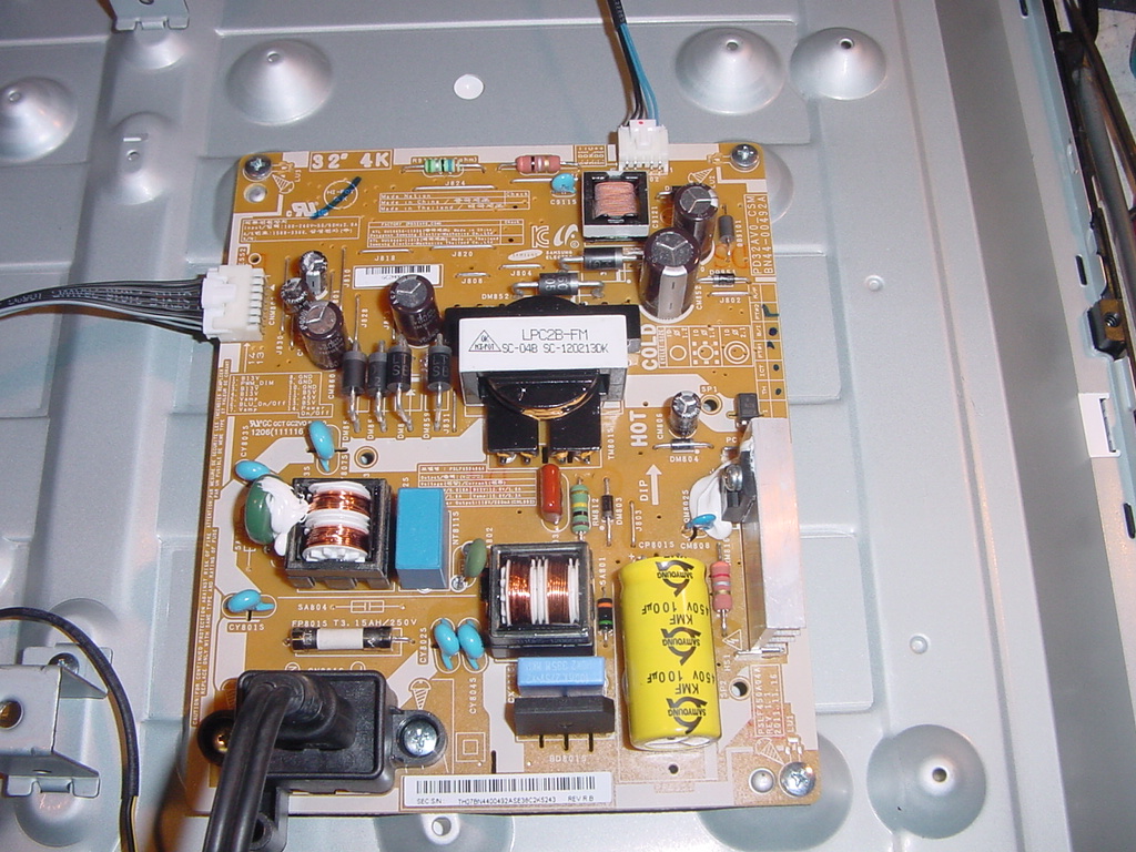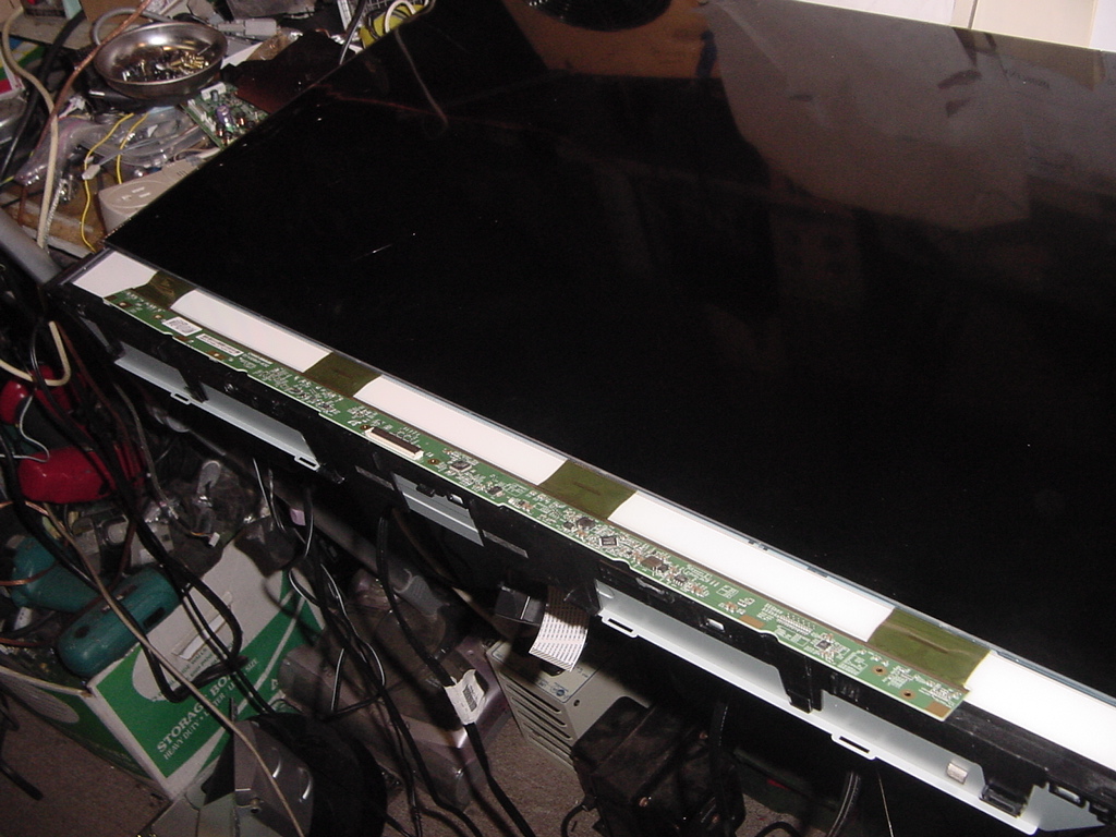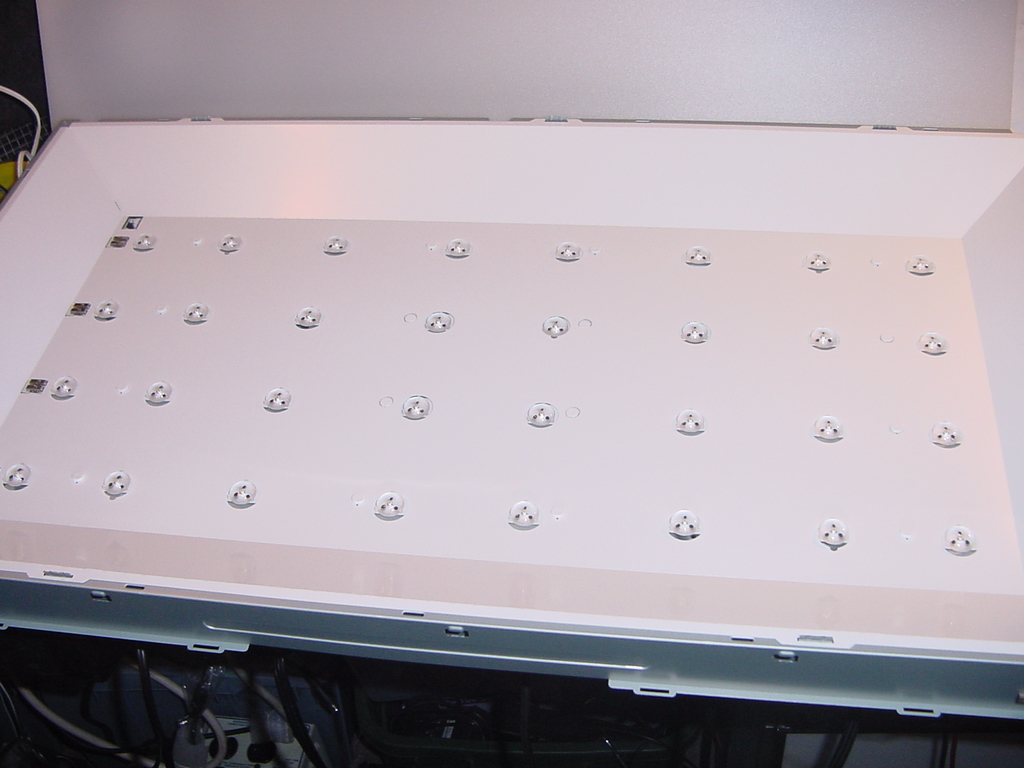 I just got this one in today, it has broken LCD panel, so I decide to open it up to see how the TV with LED backlights works. It has 32 white LED hooked up in series to 90V DC power supply.