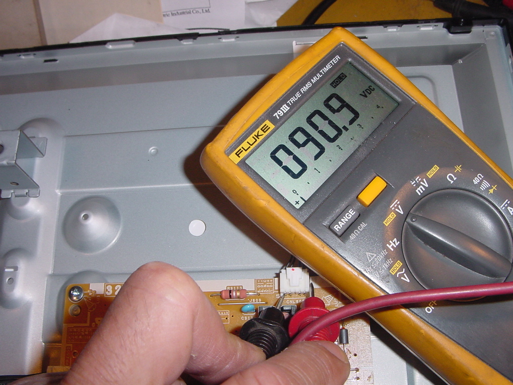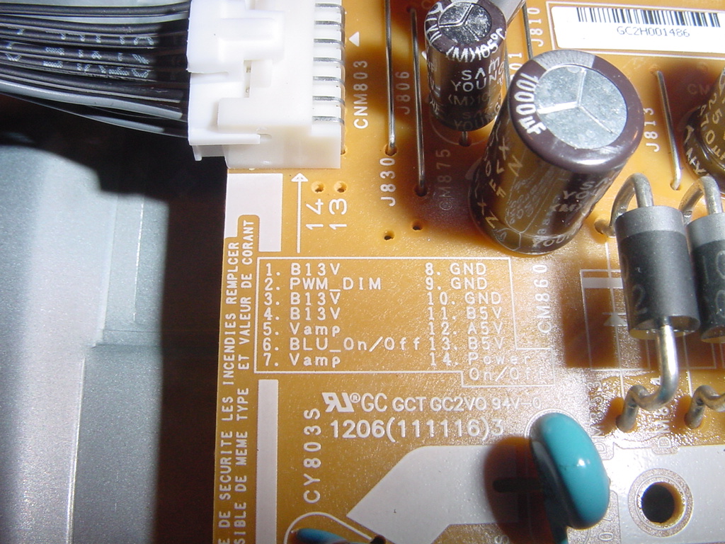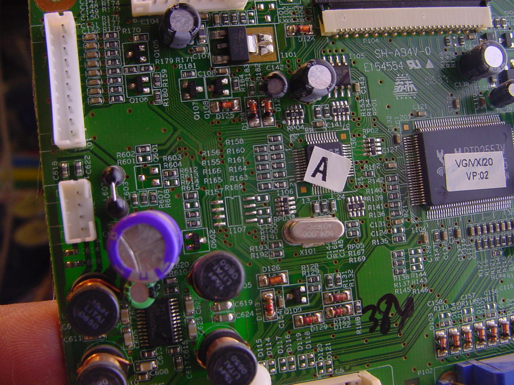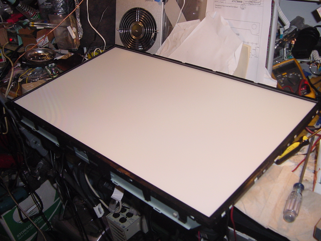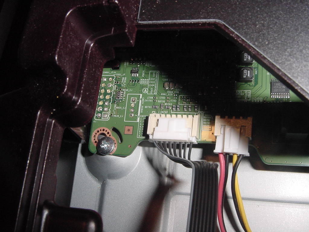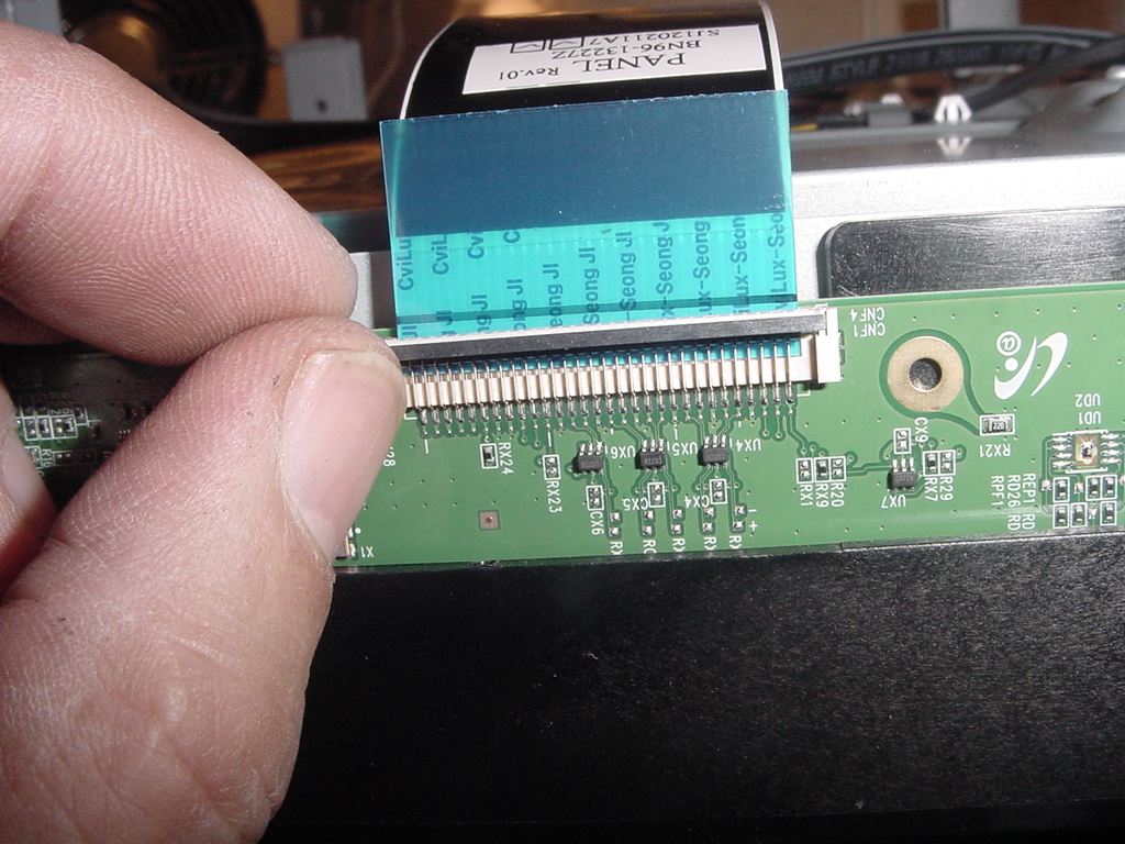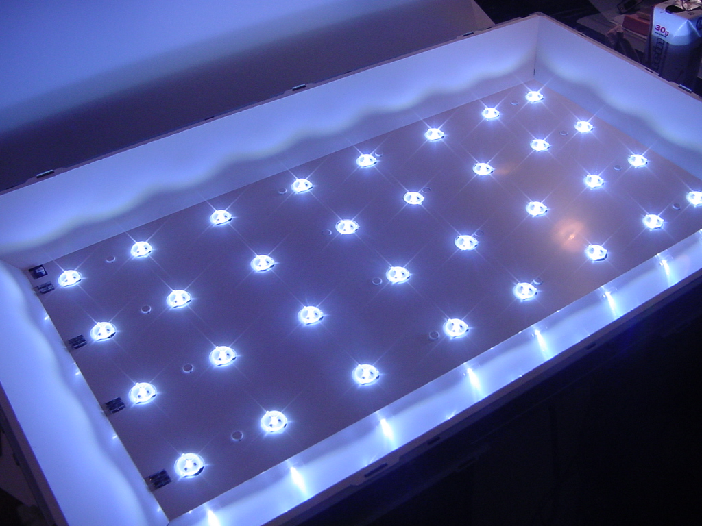 I just got this one in today, it has broken LCD panel, so I decide to open it up to see how the TV with LED backlights works. It has 32 white LED hooked up in series to 90V DC power supply.