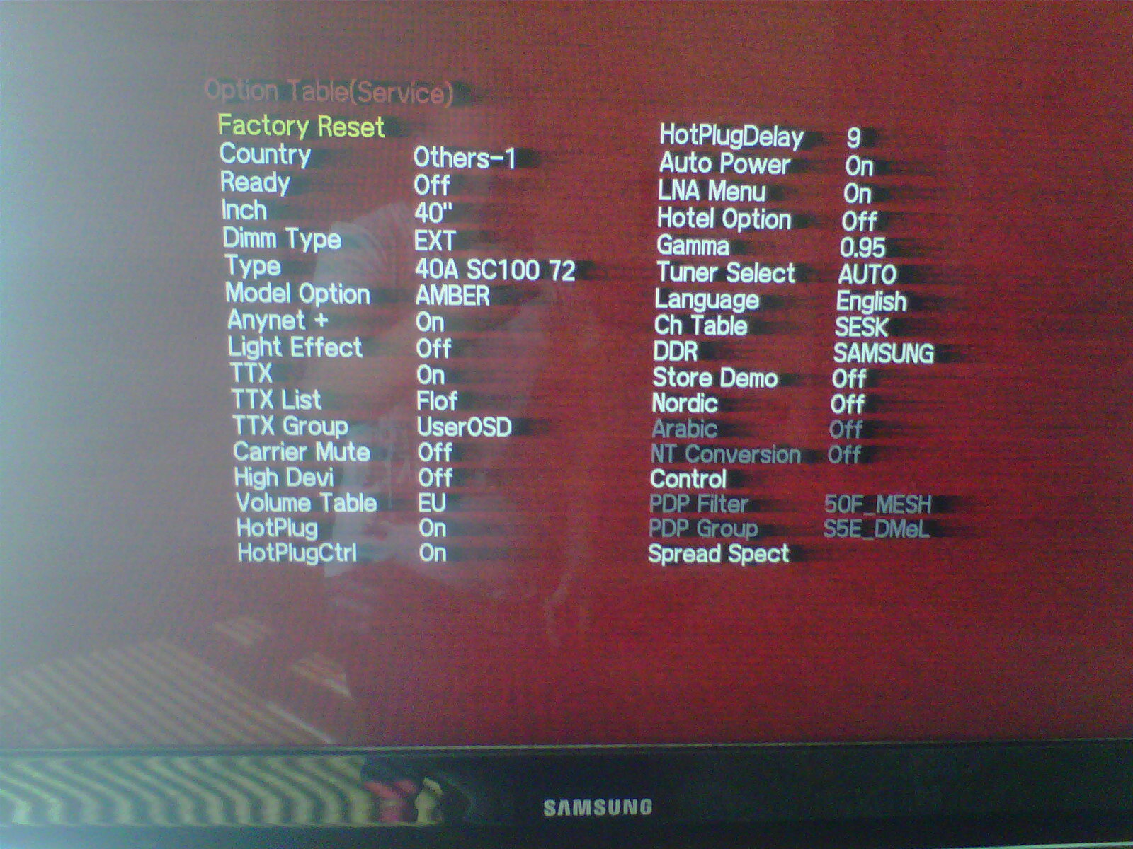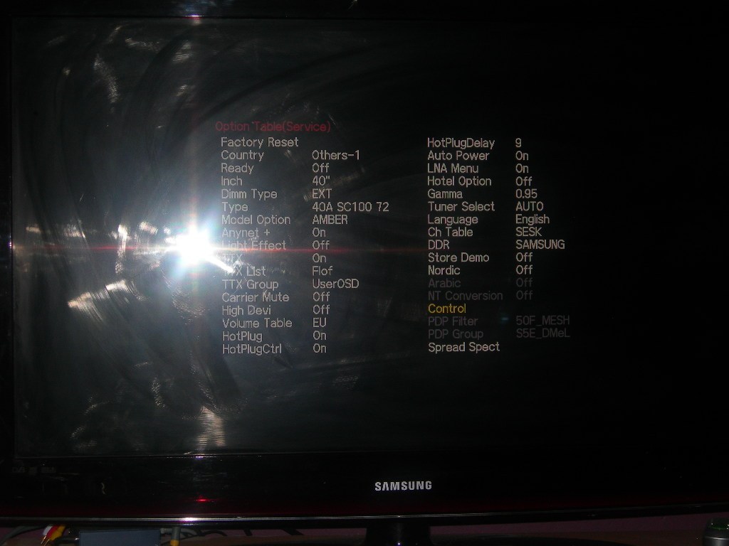 OK, I think your EEPROM has definitely got corrupted, which is very common when the capacitors on the power supply go bad. For example, your country is "Others-1"; I think it should be "Europe" or "UK" - I'll check on mine at home. What I suspect has happened is the panel settings have changed causing your issue. I will get a picture of my settings page and see if anything is different.