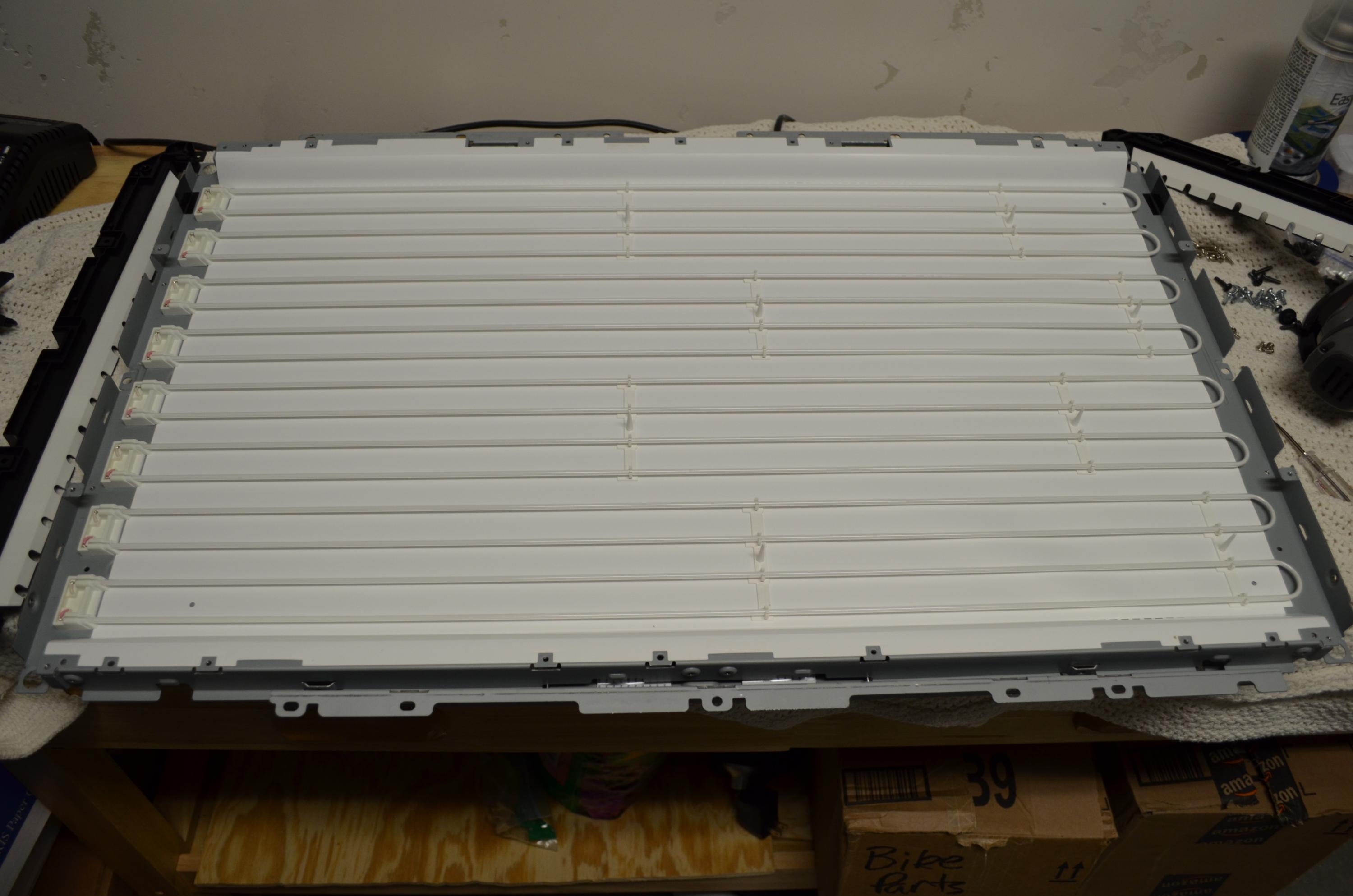 I just got this tv today and it appeared to have no backlight on. After taking off the rear cover and checking again in the dark I can see that MAYBE one quadrant is lit.. But still it's quite dim. I was going to check the LEDs with my tester, and I found LED 1 and LED 2 + pins on the wire from the inverter, but I couldn't identify a ground. Nonetheless I tried using a mounting screw on the inverter board and also the chassis as ground but regardless my tester reads 300 which is what it reads when there is no voltage draw.