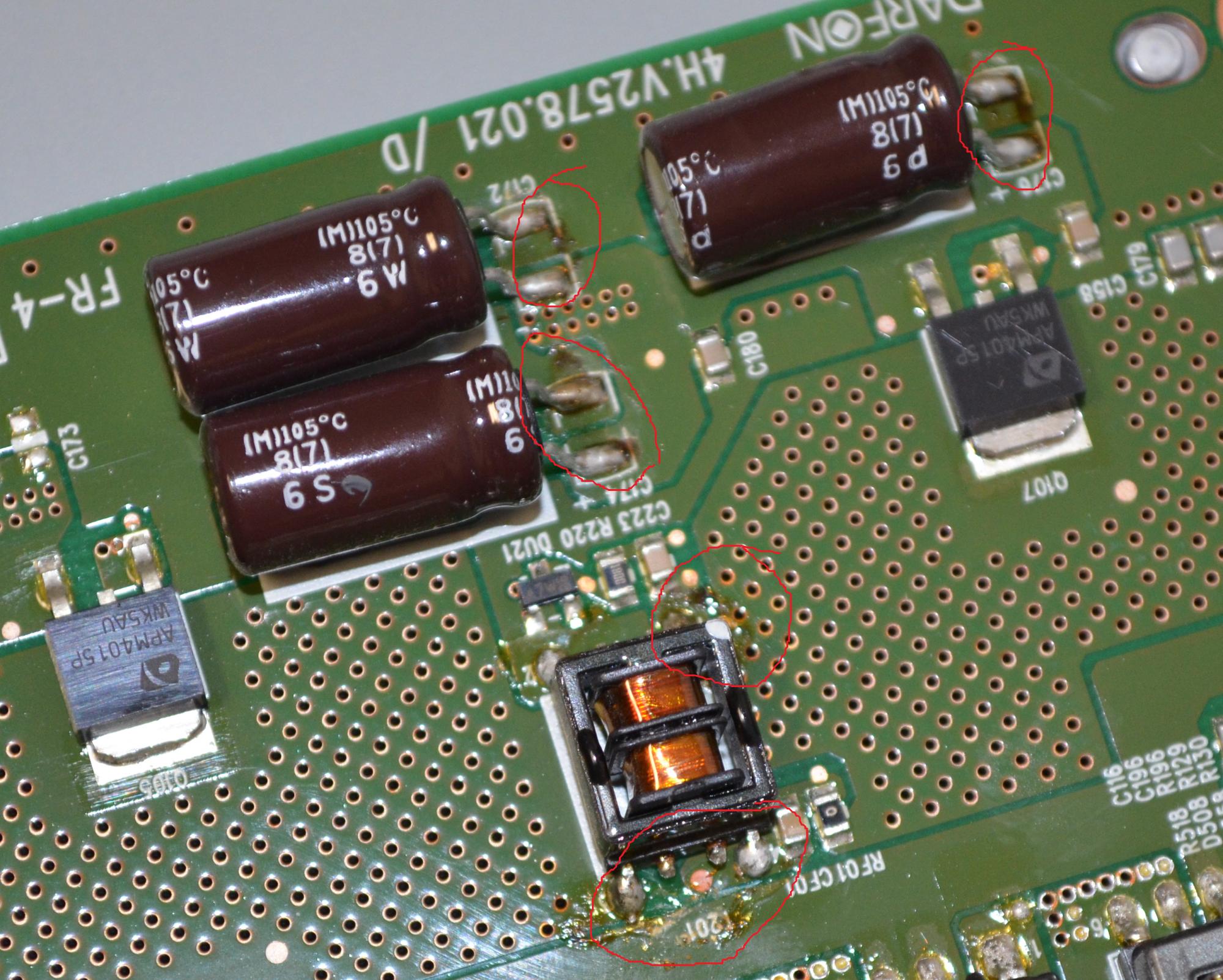 I just noticed these marks on my board. I circled them with red on the picture. Could this mean some of those components failed and damaged the board? Or is it just bad manufacturing...I'm really suspecting the inverter board to be the culprit here and I think I might just need to replace the whole thing.