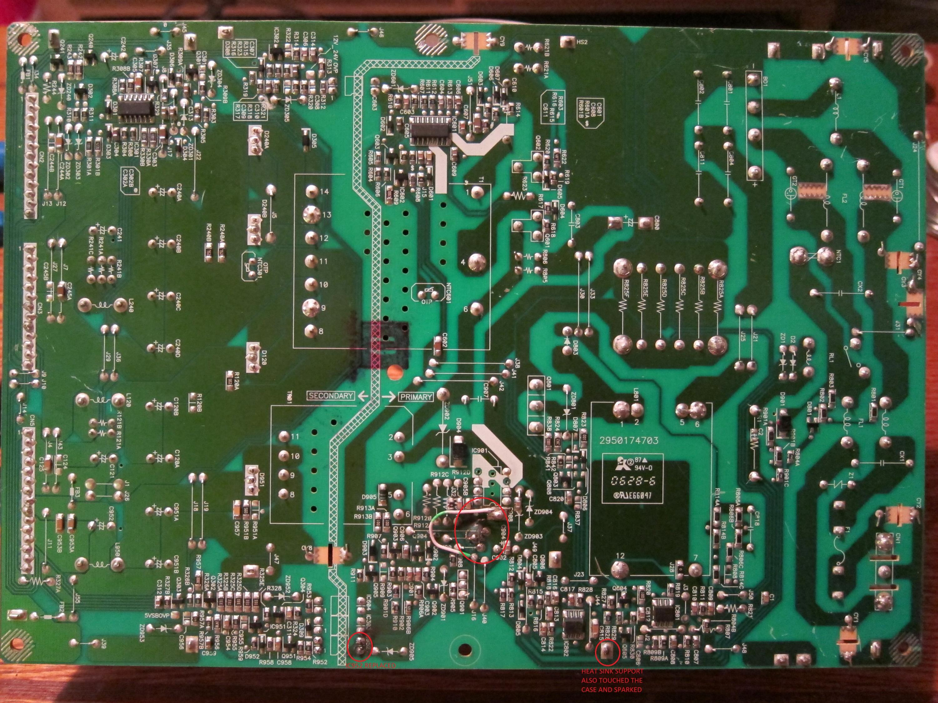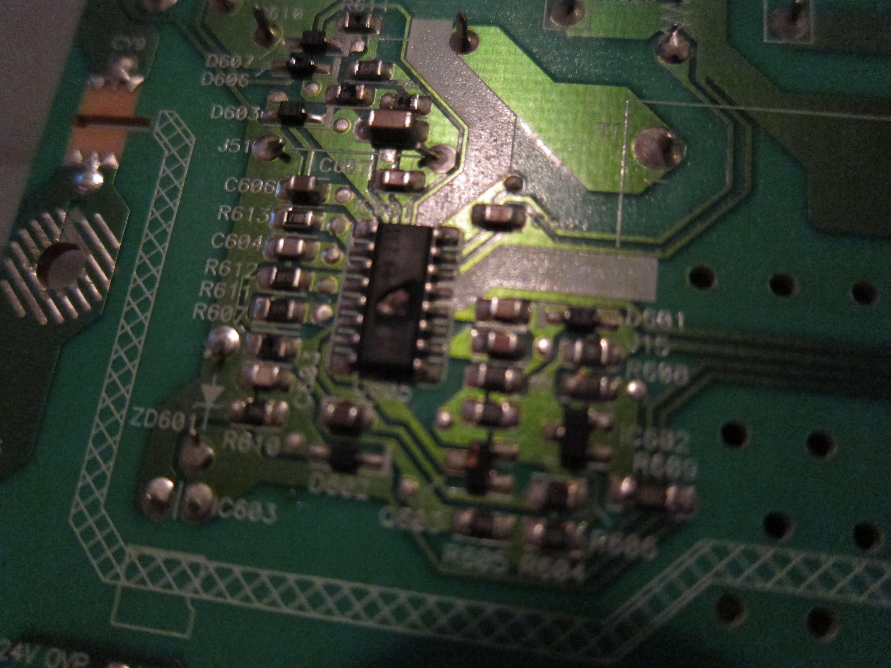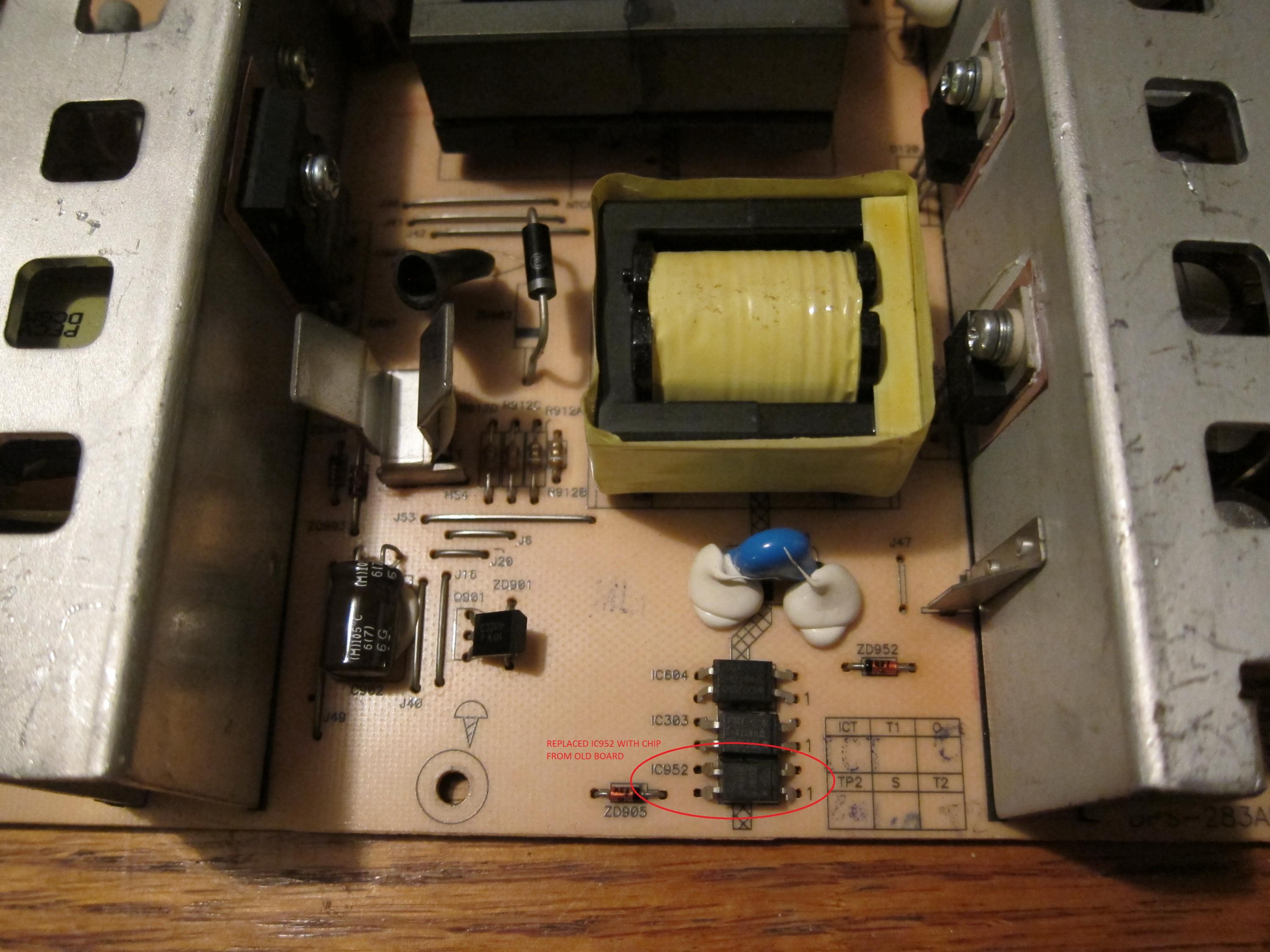 None of the caps look like they're bulging/exploded/leaking. The only suspect thing I can see on the board is IC601 (on the bottom) looks like its been gouged out in the middle of the chip.