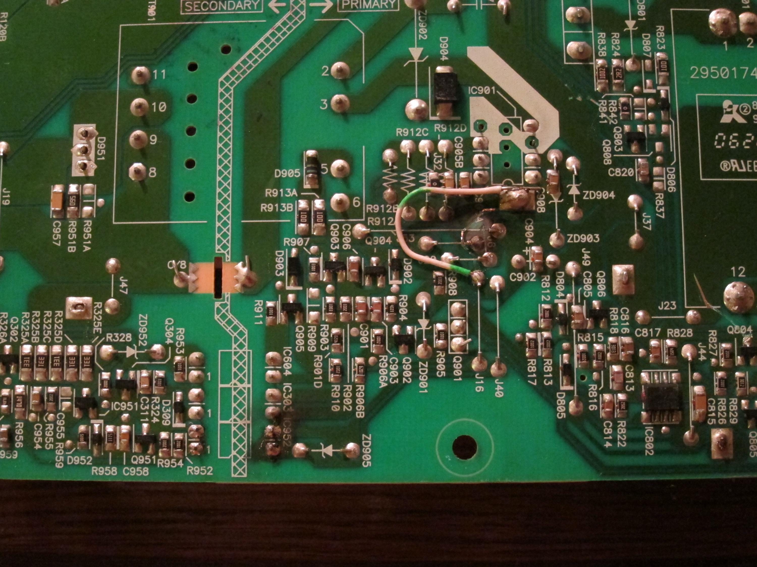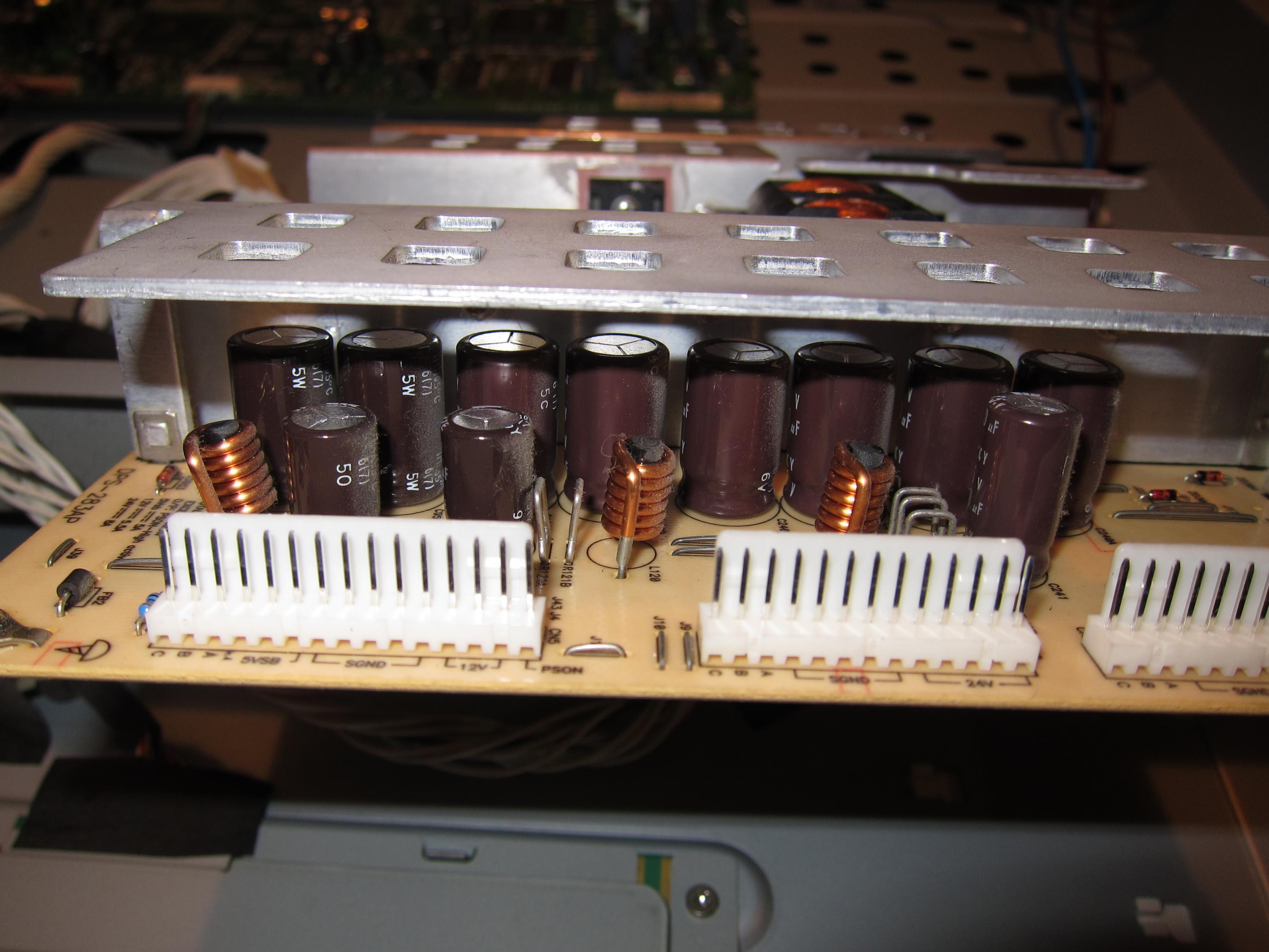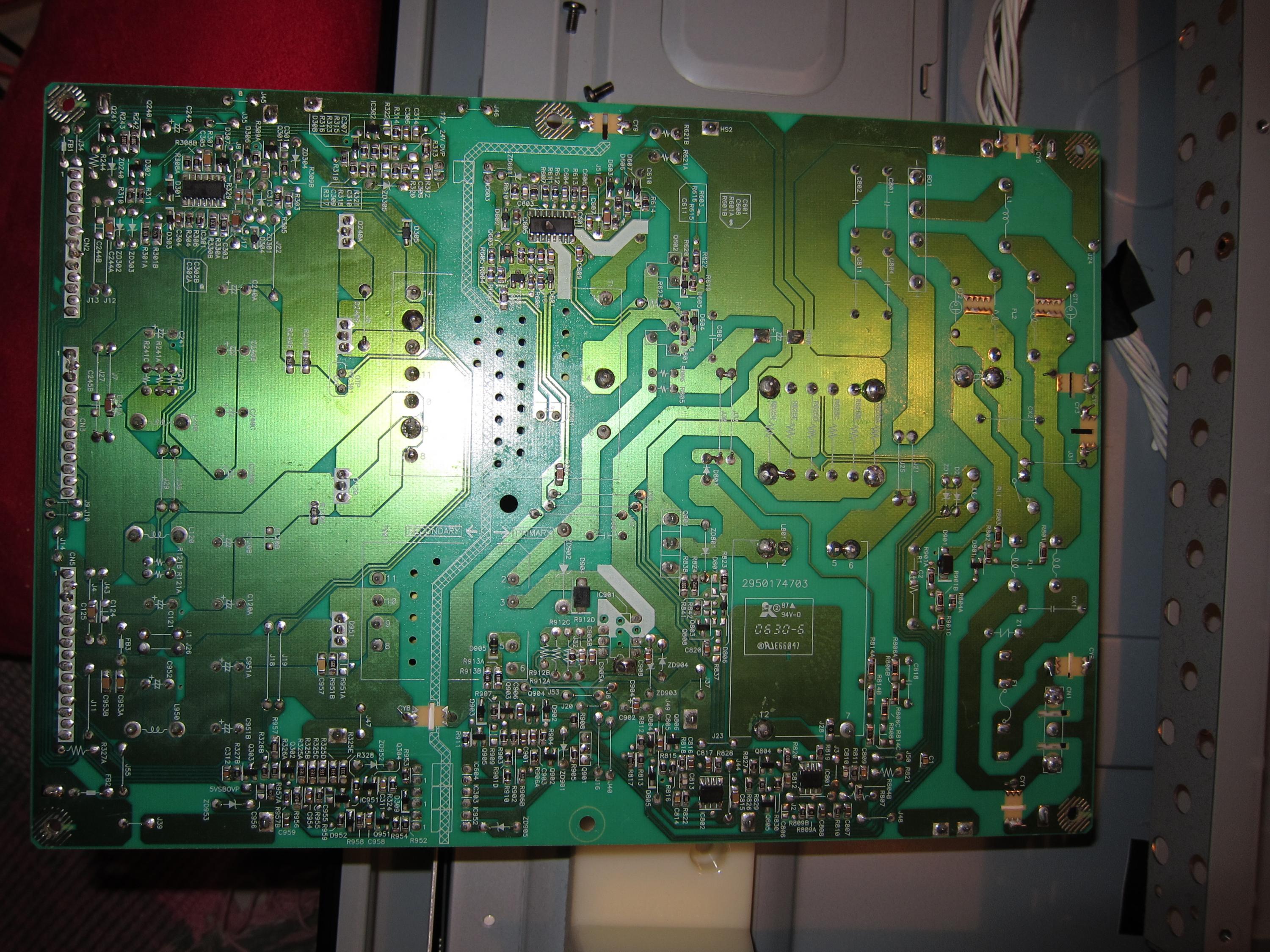 None of the caps look like they're bulging/exploded/leaking. The only suspect thing I can see on the board is IC601 (on the bottom) looks like its been gouged out in the middle of the chip.