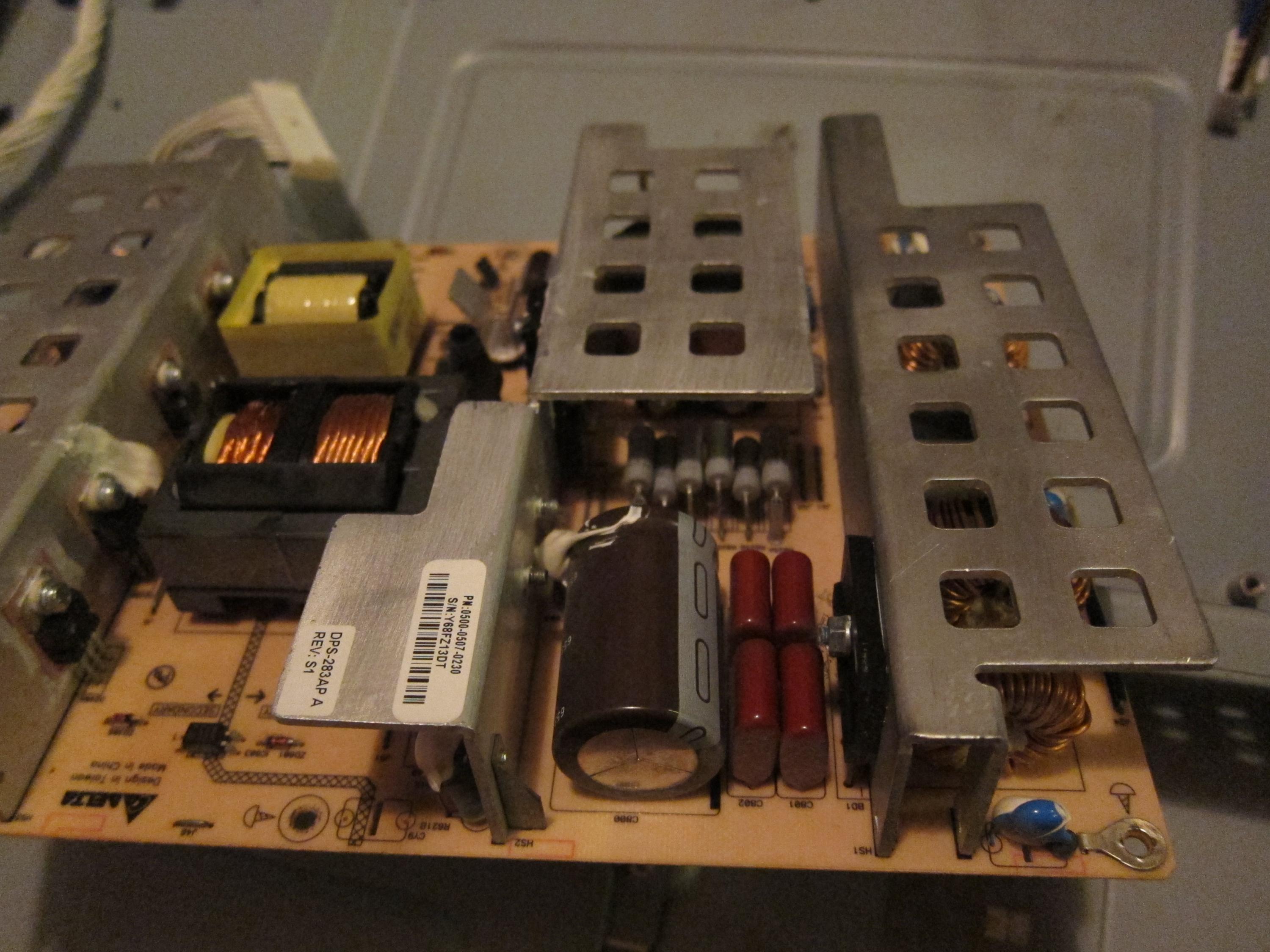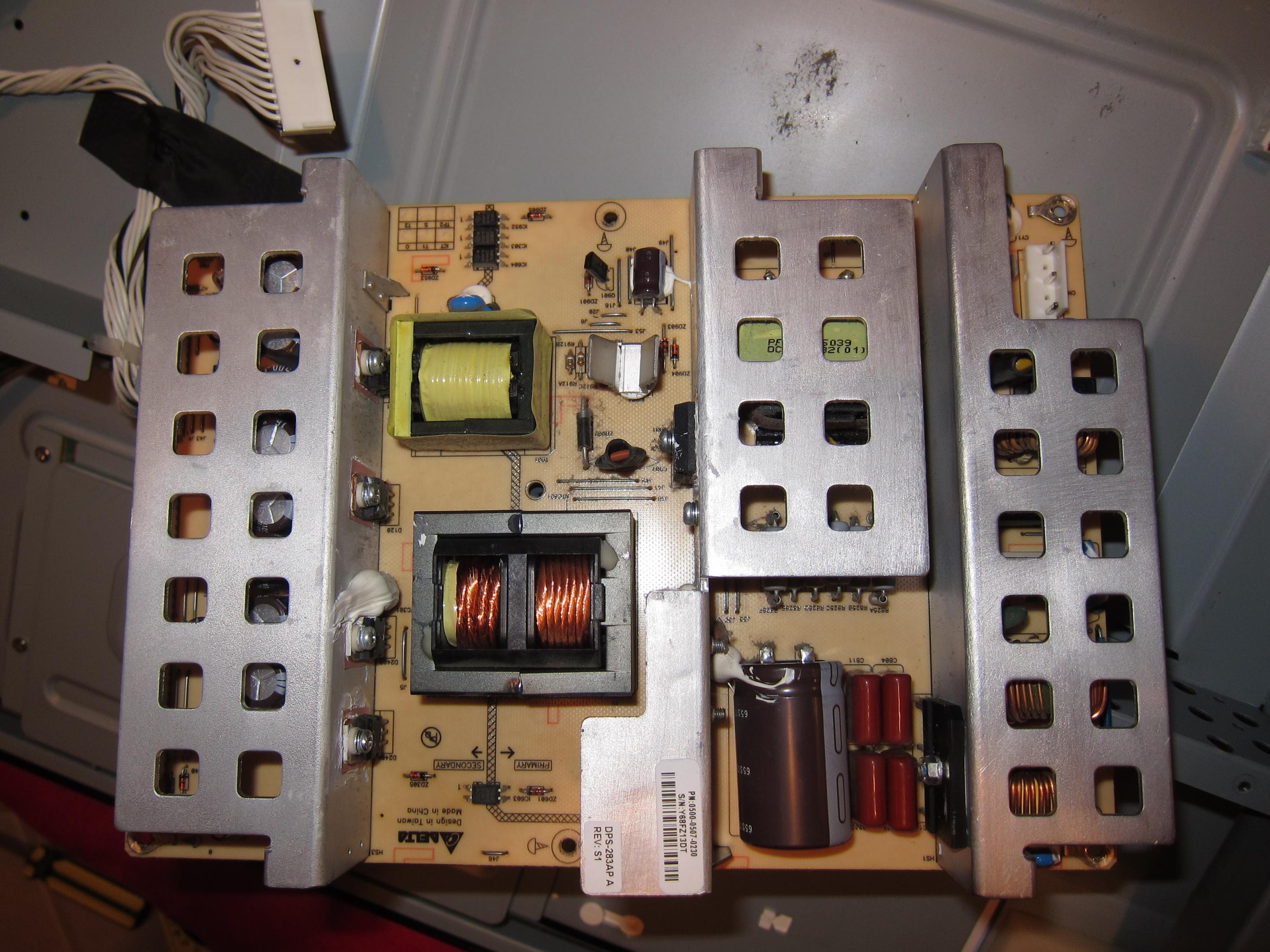 My Vizio set completely stopped working a couple days ago after we heard a loud pop while watching TV. Plugged into the wall I can't get anything to light up. Took off the back and checked the power supply board: