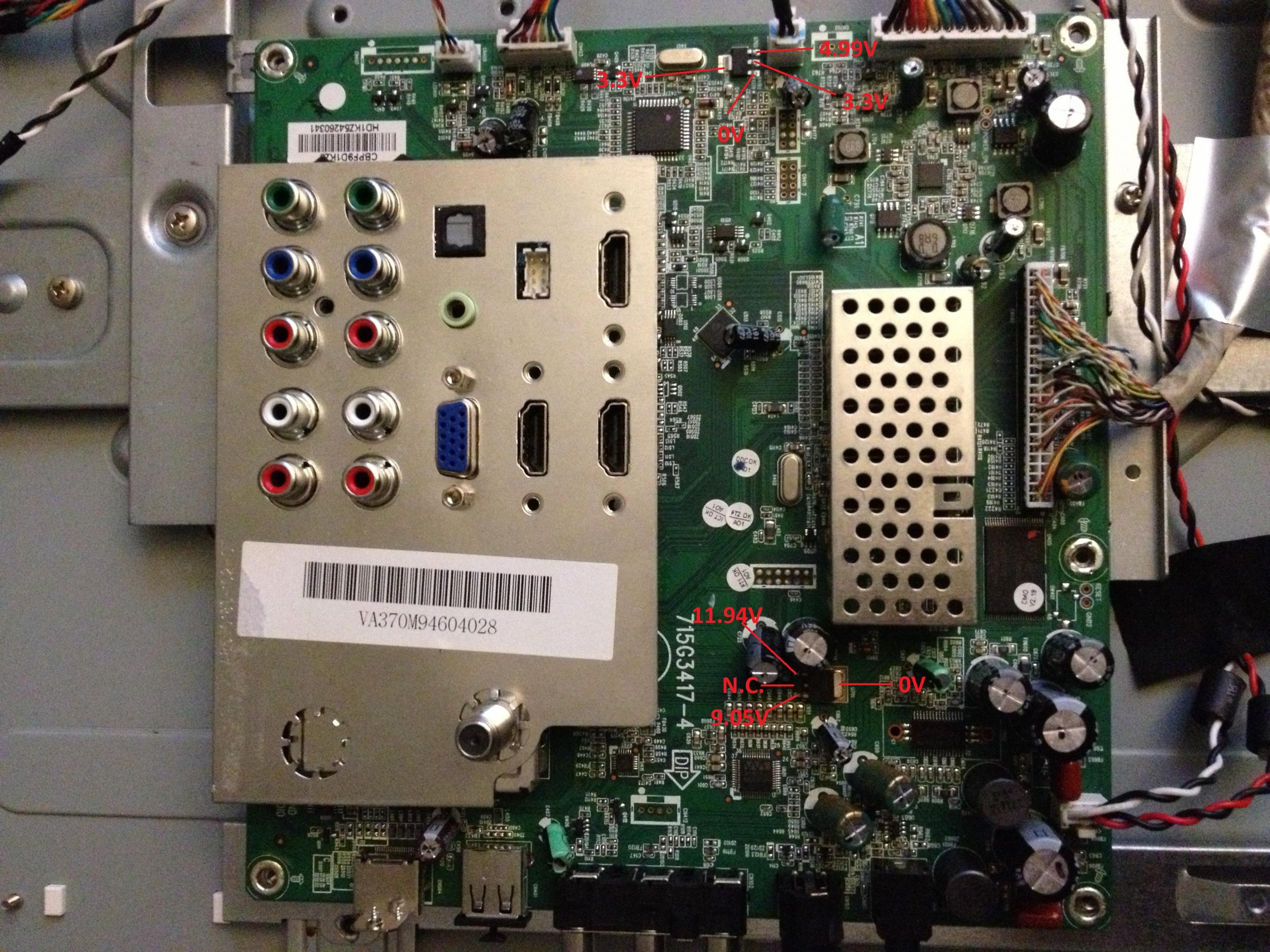 I have a Vizio VA370M which will not power on. When I hit the power button the vizio logo changes from amber to white but nothing else happens. I've already diagnosed this as a bad main board. My boards model number is CBPF9D1KZ5. I tried a CBPF9D1KZ7 board in it and the lcd powered on but had interlacing issues. I had read that some other vizios had issues with bad regultors so I've measured the two regulators I can find on the front of the board and attached a picture. There is one other voltage regulator on the back of the board which I have not checked yet. Any help is appreciated.