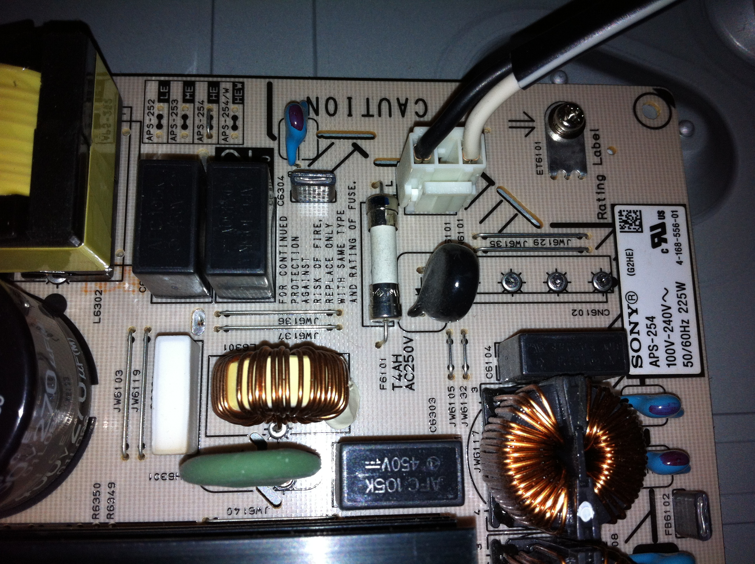 So I have a 40" Sony KDL-40EX400 that was struck by lightning this summer. The unit was on and in use when the power went out. I'm getting absolutely no power to the unit, though I'm lacking a multimeter at the moment. None of the capacitors look blown, except maybe the rather large one. It's flat on top, but not flat/concave like all of the smaller ones.