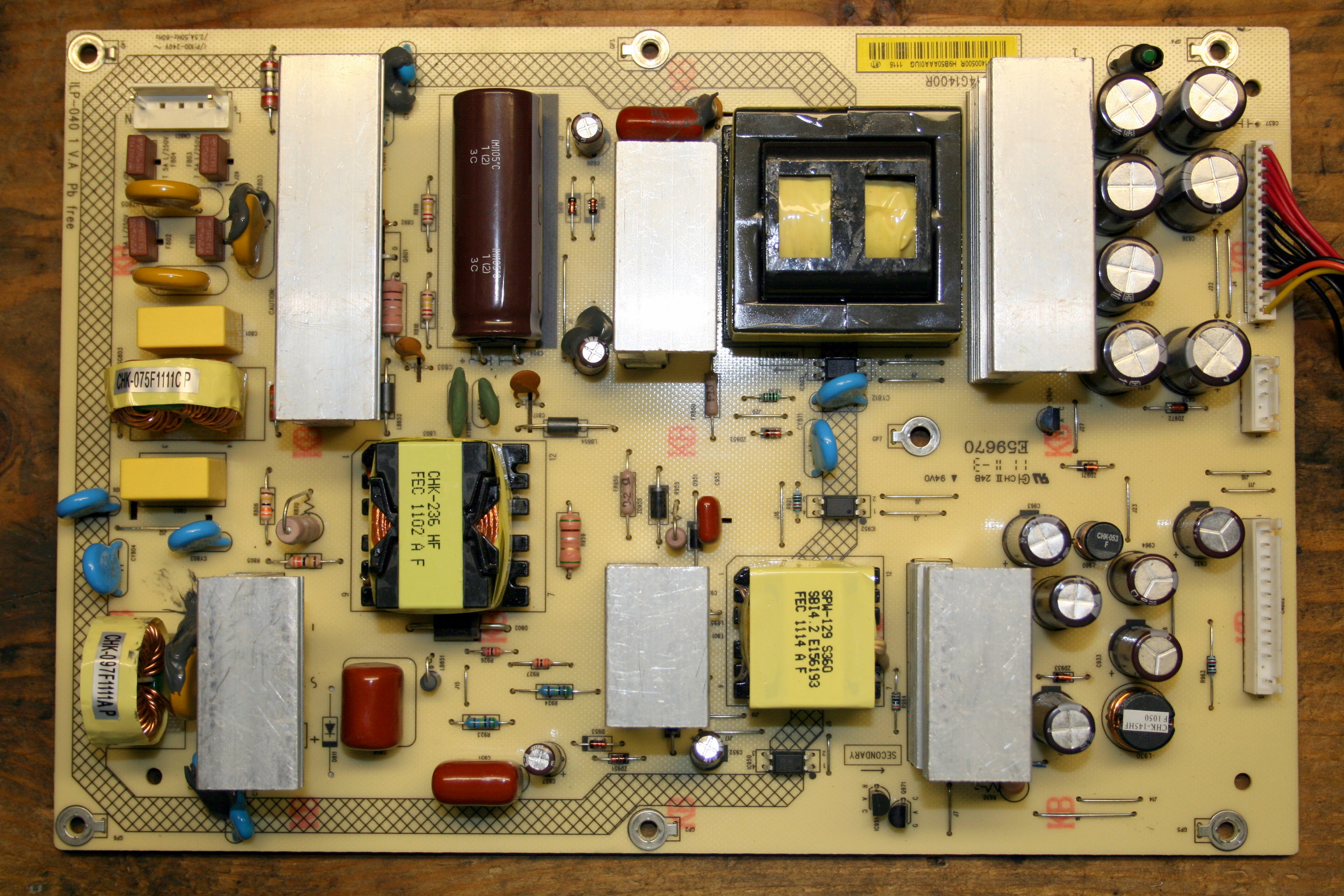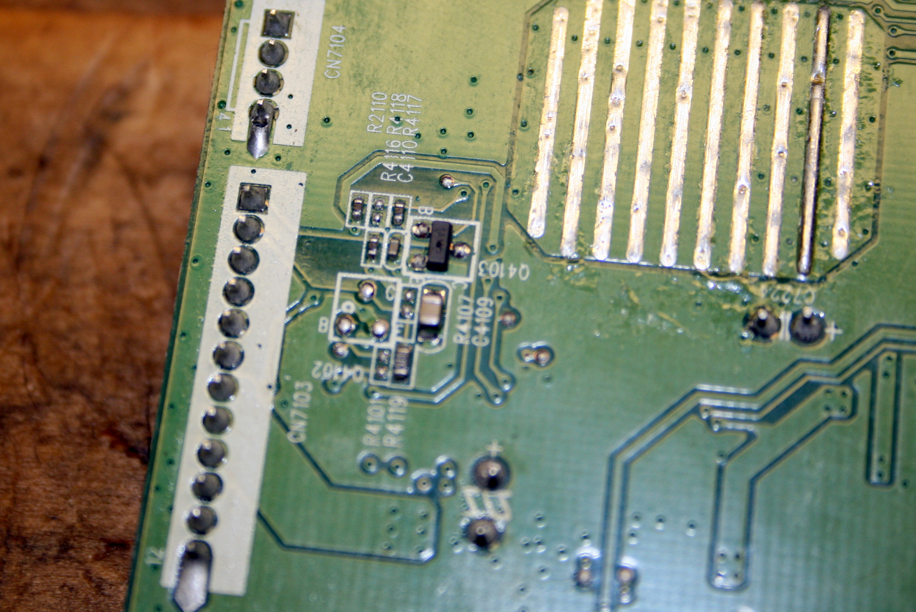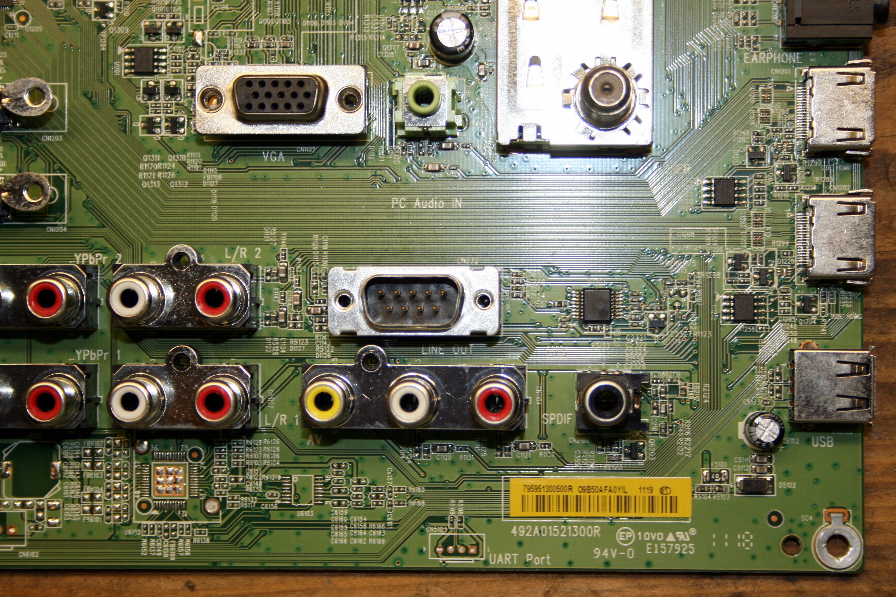 Anyways, here is my story. I have a Sharp Aquos LC-42D69U that does not power up. It has no standby LED, but the PSU does output +5VSB. If I manually short PS_ON and BL_ON to +3.3v I can see the backlight illuminate the display, however, the motherboard still has no logic. I've soldered wires to the TTL (serial) output to see if I can see anything from the processor. I used 9600 and 115200, 8, N, 1, but I didn't get any output. I purchased another identical motherboard (PN# 795951300500R from eBay, but I still have the same results. I'm stumped! I've been referencing the service manual for repairs (sharp_lc-32d59u_lc-42d69u.pdf). Here is what I've done so far.