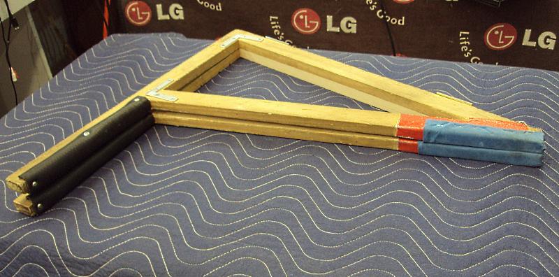 A few years ago I decided that I needed a universal stand that I could use for testing/troubleshooting flat panel TVs. I came up with a prototype that has proven extremely simple and useful. It is basically a TV easel, originally designed to handle TVs up to 50". I have worked on TVs as large as 70" with this stand, but I really need to make it a little larger. After a discussion with Tom66, I realized that the stand I have made could be useful or adapted by others who do a lot of TV repair. Please keep in mind that this was only intended as a prototype, so it is not very pretty, but too many entries on the "Honey-do" list have prevented me from rebuilding it. Maybe over the holidays . . .