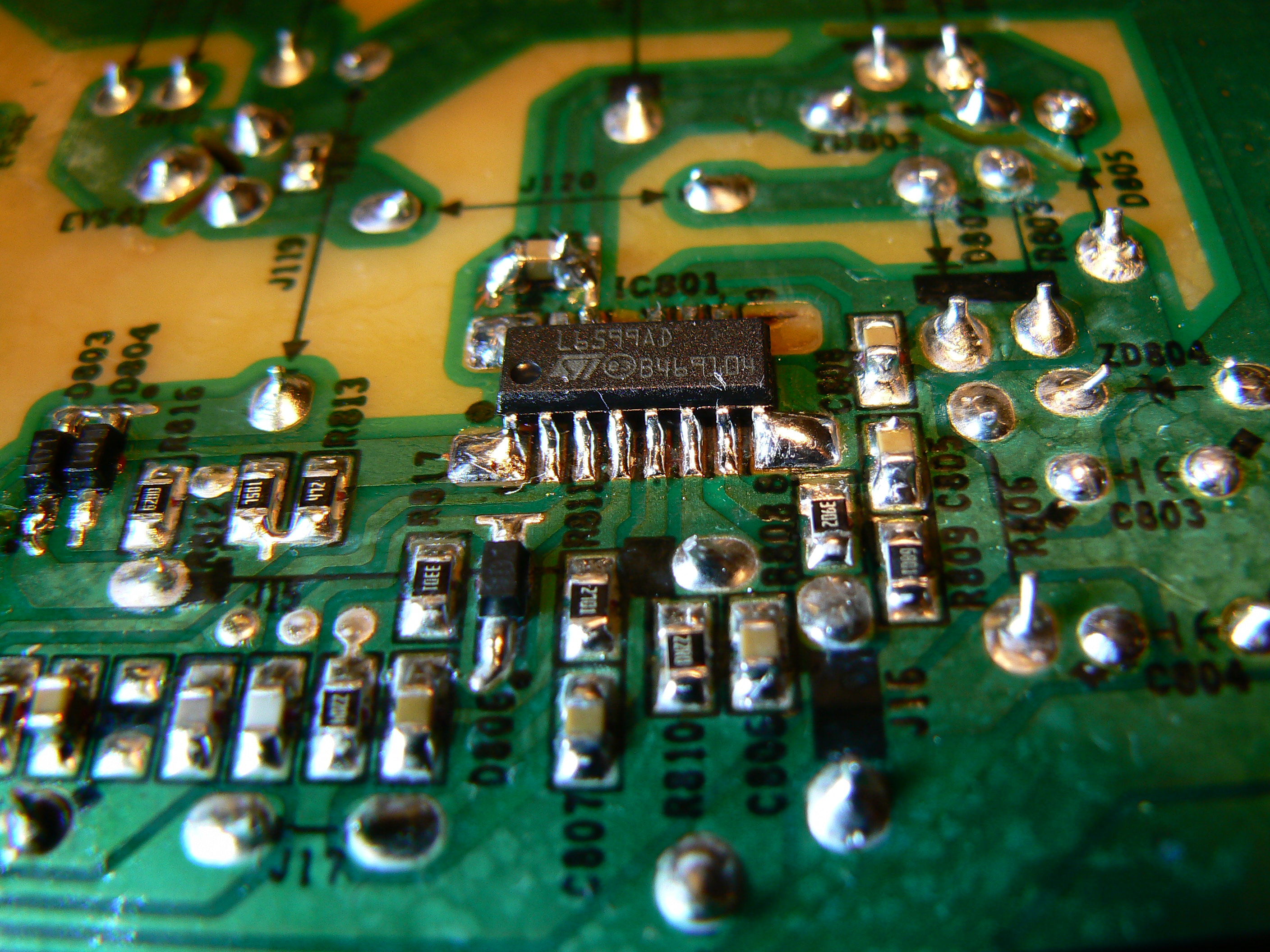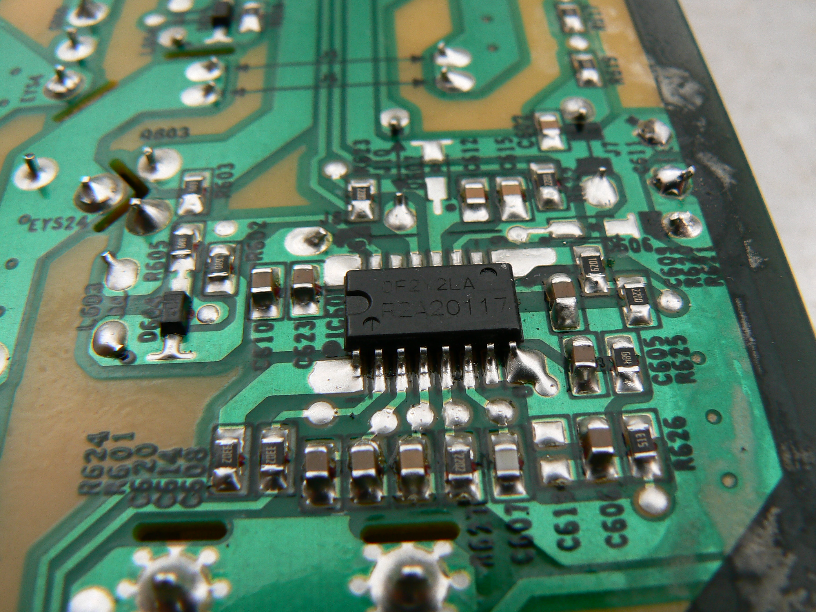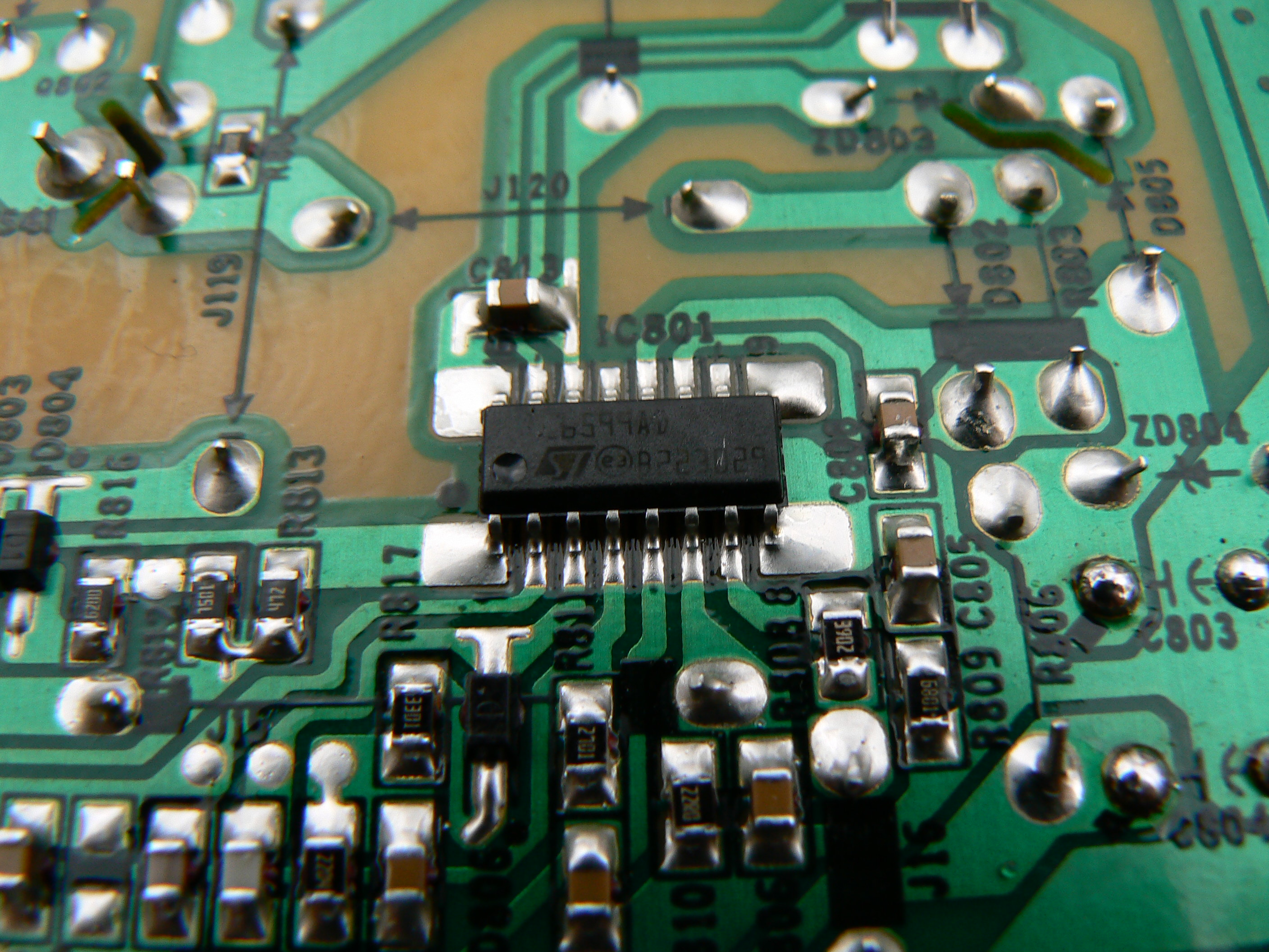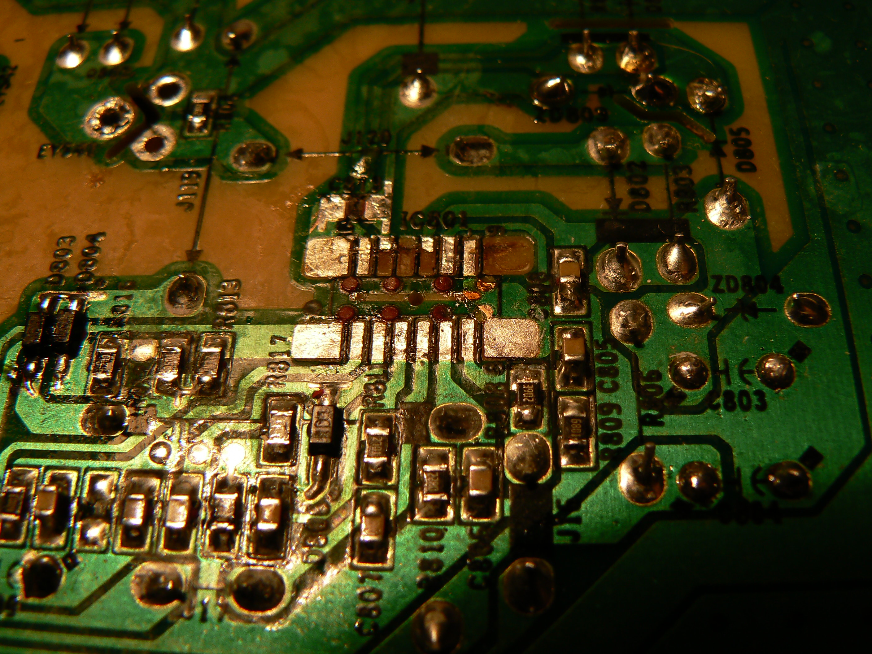 IC801 was directly connected to the two FETs I had shorted and was giving me some suspicious readings when I was testing it. The problem I had was that I did not know what would constitute correct readings. Since Digi Key had these chips in stock and it was cheaper than just one of the FETs I decided to order one just in case. This past weekend I found some FET's that had very similar specs as the two I had fried except they had a slightly lower Amp rating but everything else about them matched. I decided to temporary use them to see if I could get the supply to turn on again. With these in place the supply was still not turning on but it was no longer blowing the fuse like it had been when the shorted FETs were in the board. Today I received my parts and I replaced the FETs, IC801, and the 22 ohm 5W resistor. Unfortunately, I used my iron to desolder IC801 instead of my heat gun so I removed two "not connected" pads and tore two others as you can see in the pictures. Not good, but it could have been a lot worse and I did manage to get the new one soldered in place.