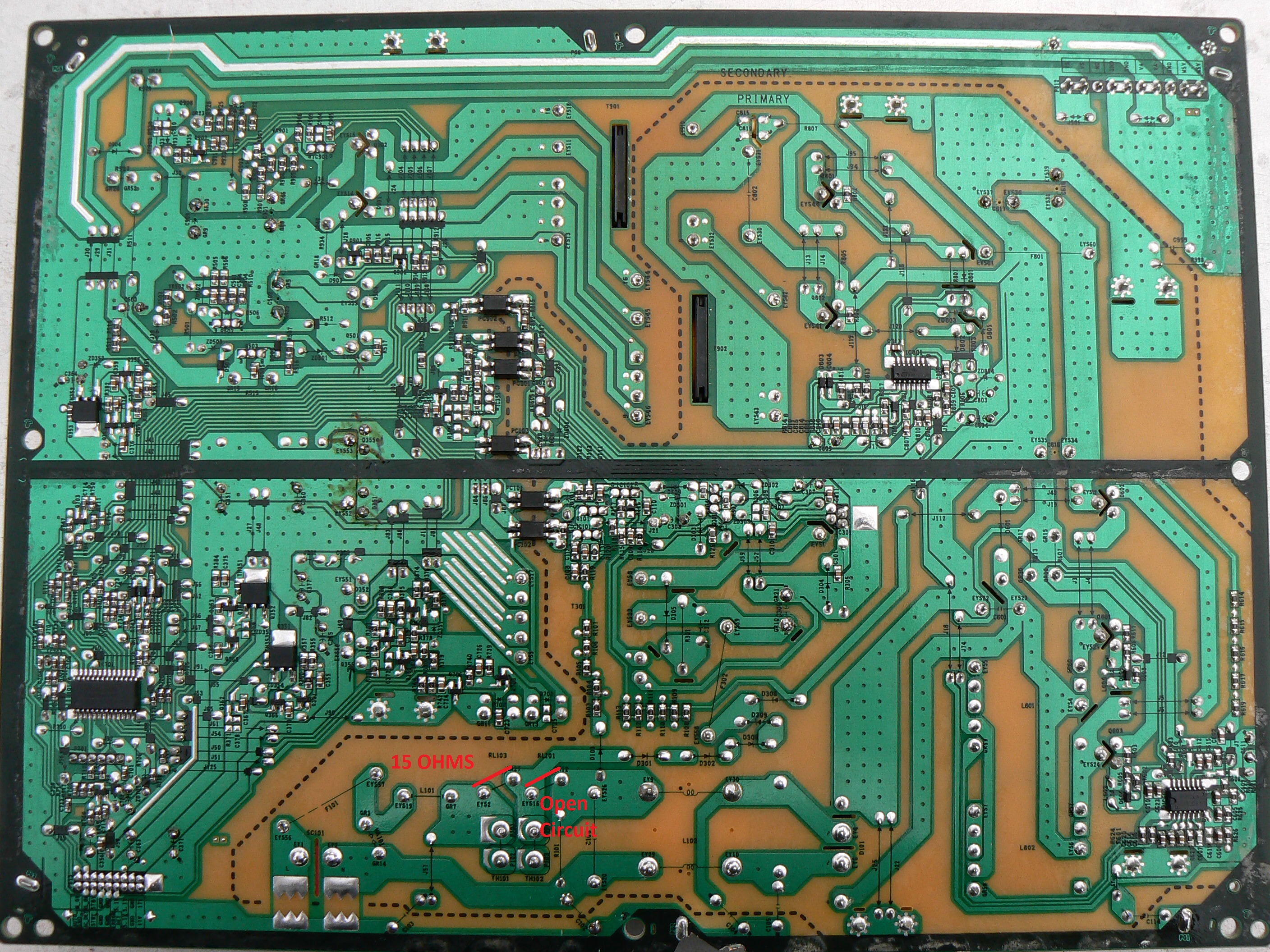 Thanks for taking the time out to look at this. I did find another LG thread that has a similar power board and in it one of the posters mentioned a tech telling him that they had a problem with the big block resistors going bad. I checked R929 22 ohm 5W in the upper right hand corner and it was open. I had some 10 ohm 5W resistors on hand so to test it I replaced the open one with two of these in series. That was when the fun began....