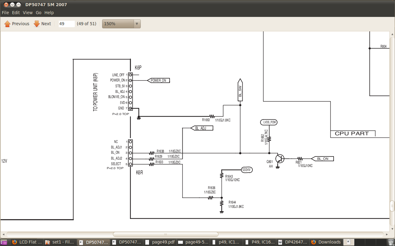 "Part II" shows voltages at KB8 and K6R connectors at main board. Voltages at KB8 appear consistent for a powered on TV with fully functional power supply. I believe P2 voltage at K6R is the "back light on signal" according to schematic on page 5. (see attachment BackLight ON circuit"). It appears to be at logic level "LOW." Do you concure? How might I force this to logic "HIGH," so that I might see all the backlight bulbs turn on? Also P5 is labeled "SELECT" and is set by a resistor network at 3.15V. Does this seem high enough to be considered logic "HIGH"?