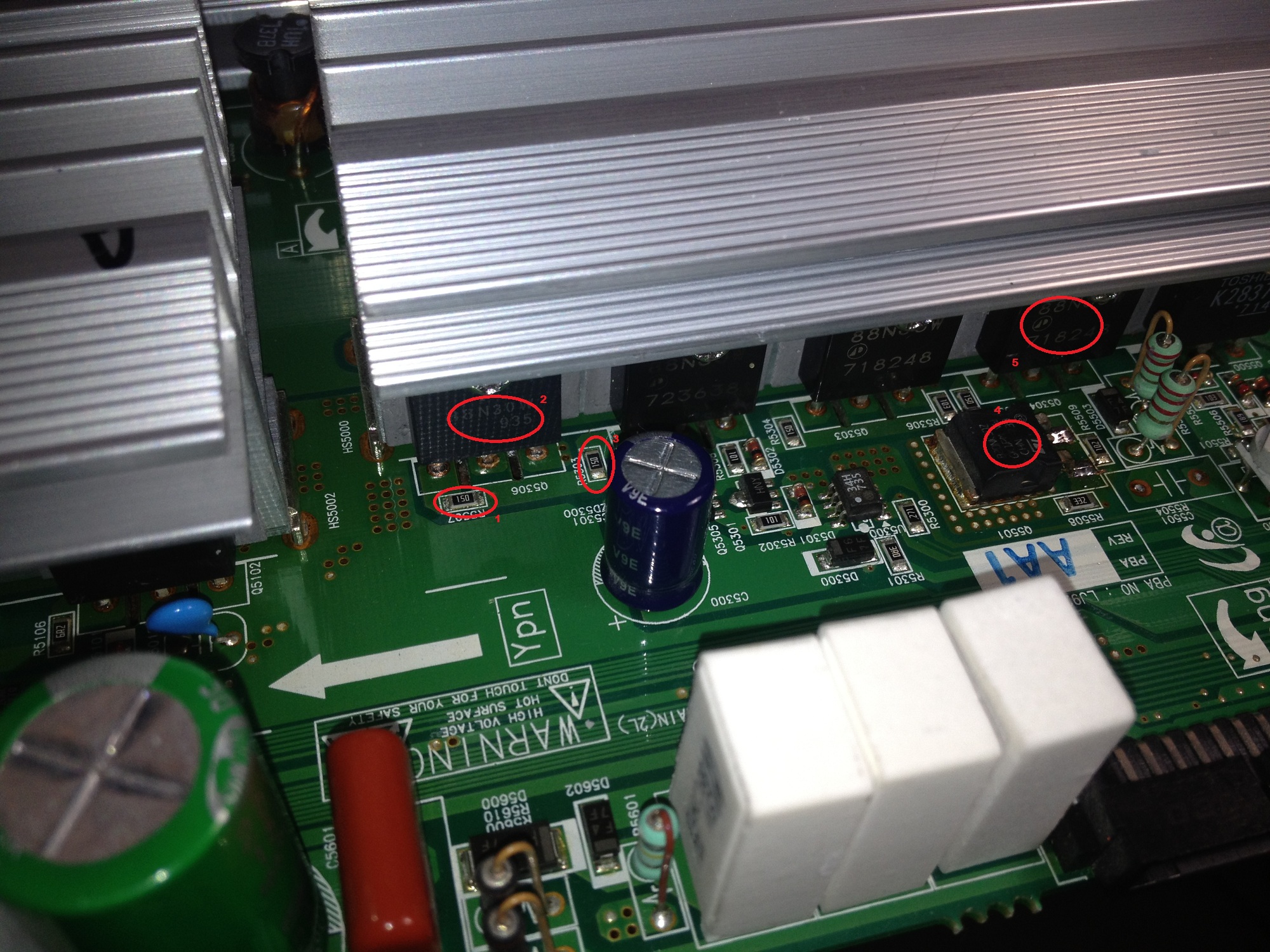 Ill try and describe what he replaced- as you are looking at the board from the angle where the component of mine had a hole burned in it- The component itself (the one you pictured) plus a small flat onboard (resistor?) next to it and the right hand FET on the heat sink right above the hole-burned component. There is a kit on ebay to repair and it looks like he did about 1/2 of what that provides. http://www.ebay.com/itm/LJ92-01490A-...item3f123998c4