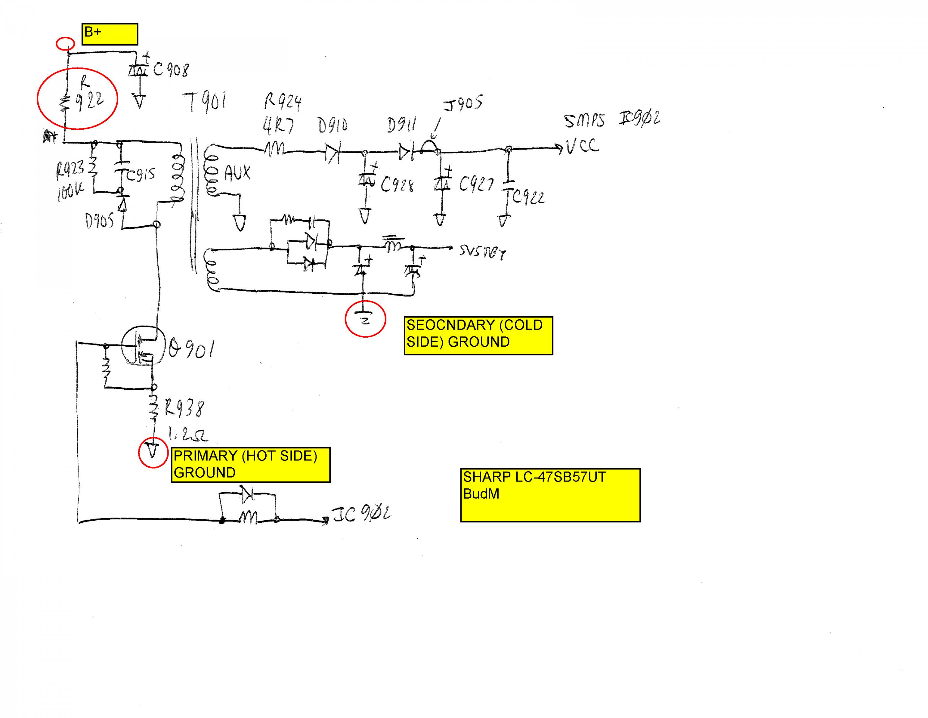 According to the parts list, that is IC902 part# "IC LD7522PS SOP-8". I could just make out D7522PS. The other is IC901 part# "IC ICE2PCS02G PG-DSO-8". According to Google Images, it looks like it is supposed to have a crater in it.