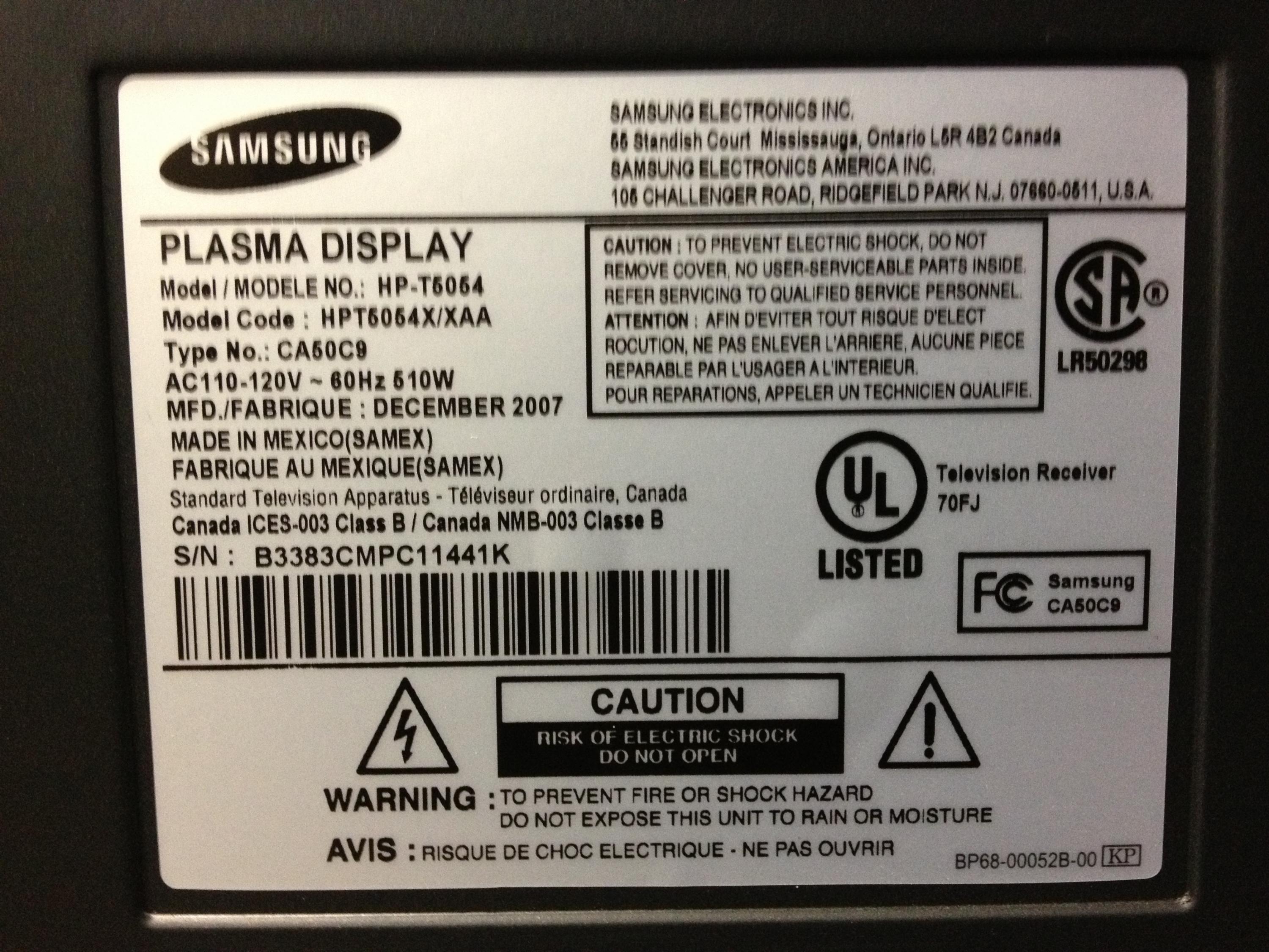 I have a 50" Samsung Plasma TV, Model HP-T5054X/XAA that won't power up. When I plug in the power cable there is a clicking noise that goes for a couple of seconds, then stops, and then starts clicking again.