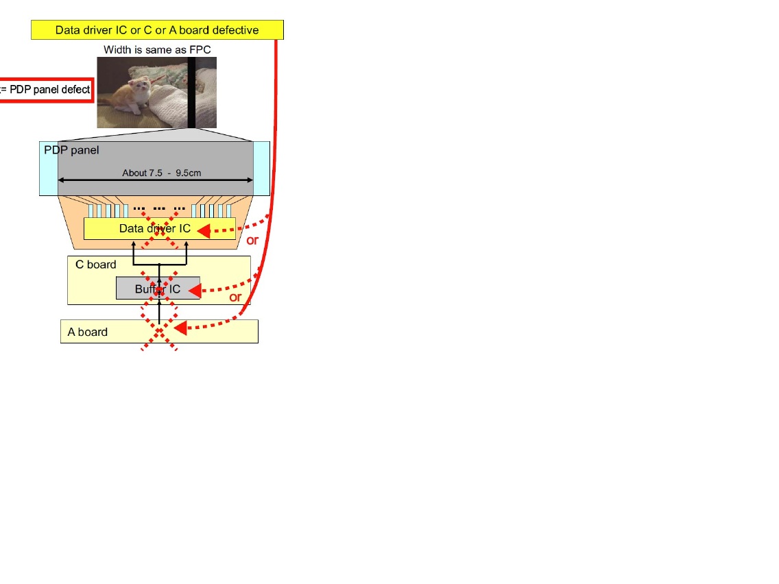 Cannot start a new thread so I thought I post it here. Similar Panasonic TV but bigger screen (VT-P65GT30) which is two years old and suddenly developed Vertical bar about 3” wide that is Yellow color under white background on the left side of the screen. Checking through website and found some Panasonic service training manual showing a similar symptom except all are black bar or red bar with no background showing. My TV shows the picture except it has yellow tint on majority of its presence. The possibilities are C3 board, or A board with occasionally PDP panel driver IC which is embedded and cannot be replaced. Am I on the right path? Any input would be helpful.