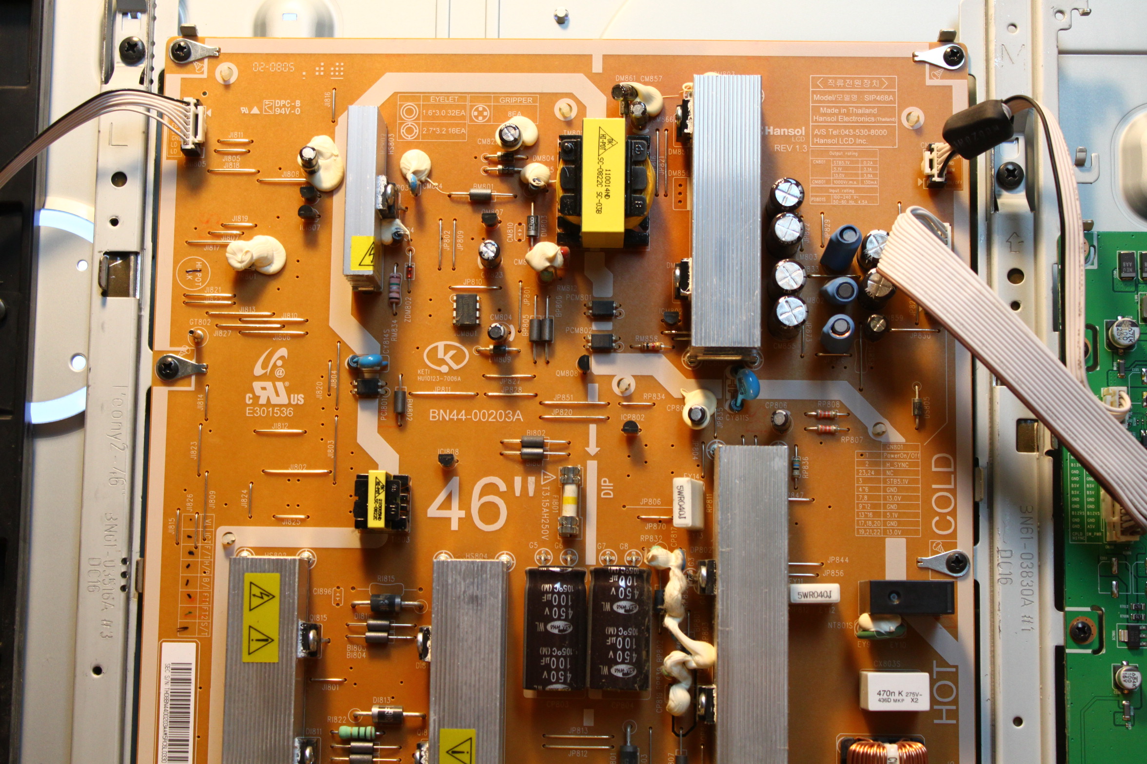 As soon as I turn it off and power it back up the vertical lines are back. Good thing I know the panel is good, seems like the ribbon cables are fine since they produce a perfect picture after the 'popping cable trick'. I didn't notice any bulging leaking capacitors on the power supply.