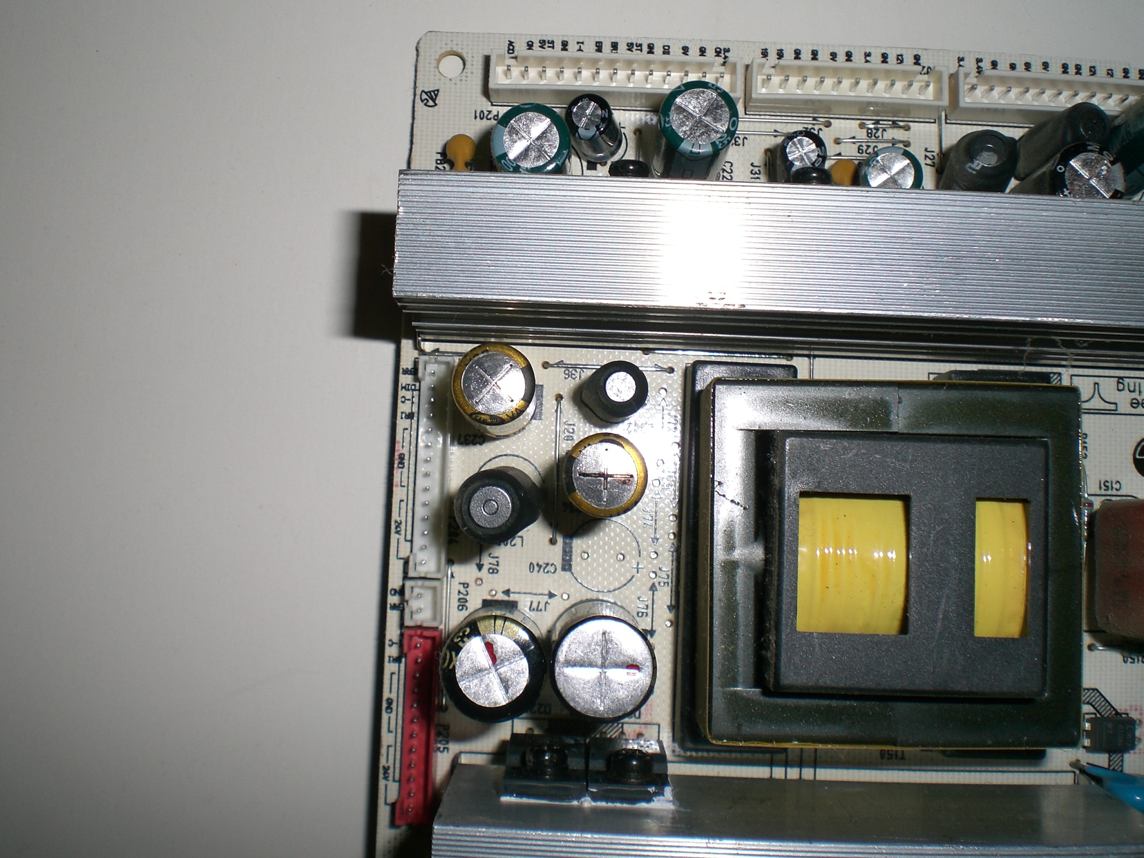 Hi there, I'm trying to fix an lg 37lc2d tv the problem that I have is that when I connect tv the green light blinks about 14 times and then it comes steady but I have no sound and video and optical output light is off, I have checked 19, 6, 3.4 and 5 volts and it seems to be ok, I can turn on the tv if I press a button on the main board that seems to be reset, the optical light turns on and about 2 seconds tv turns on, and if I disconnect and connect "3.4v on" pin from p201 tv turns on too. Another thing that I found is that 12v when I haven't pressed reset button is about 11.3v but when I press it goes to about 9v and in less a second when backlight turns on it goes to 12v