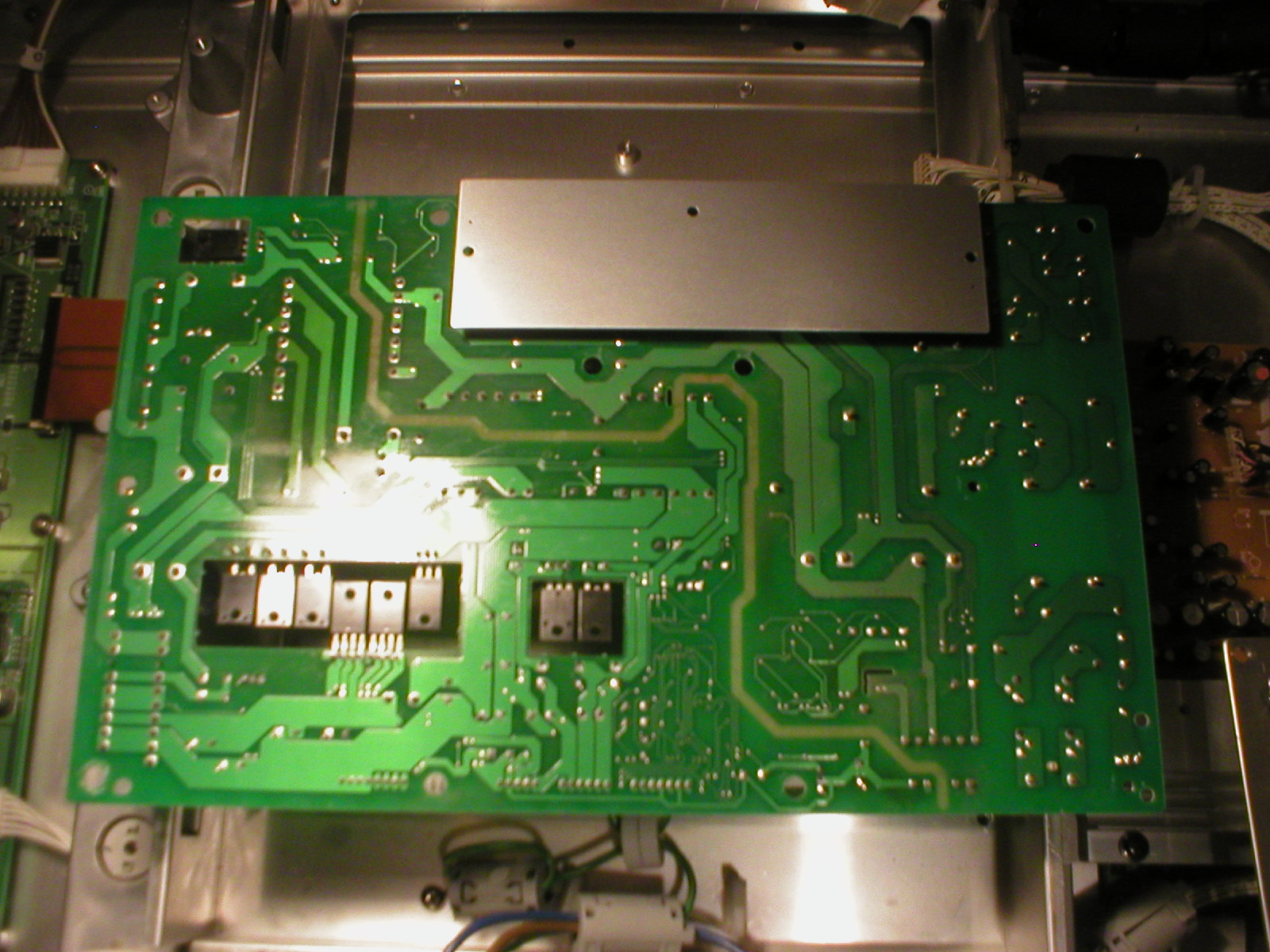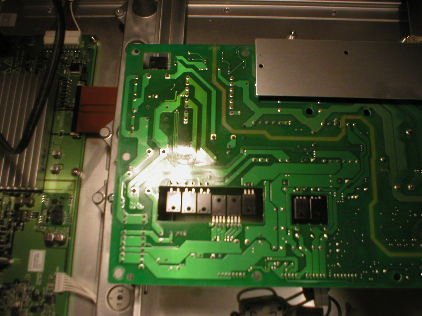 Those two black diodes -- check those. With TV unplugged & board removed, test on diode mode between pins 1-2 and 2-3, both ways. (Pins labelled arbitrarily from left to right, order unimportant.)
