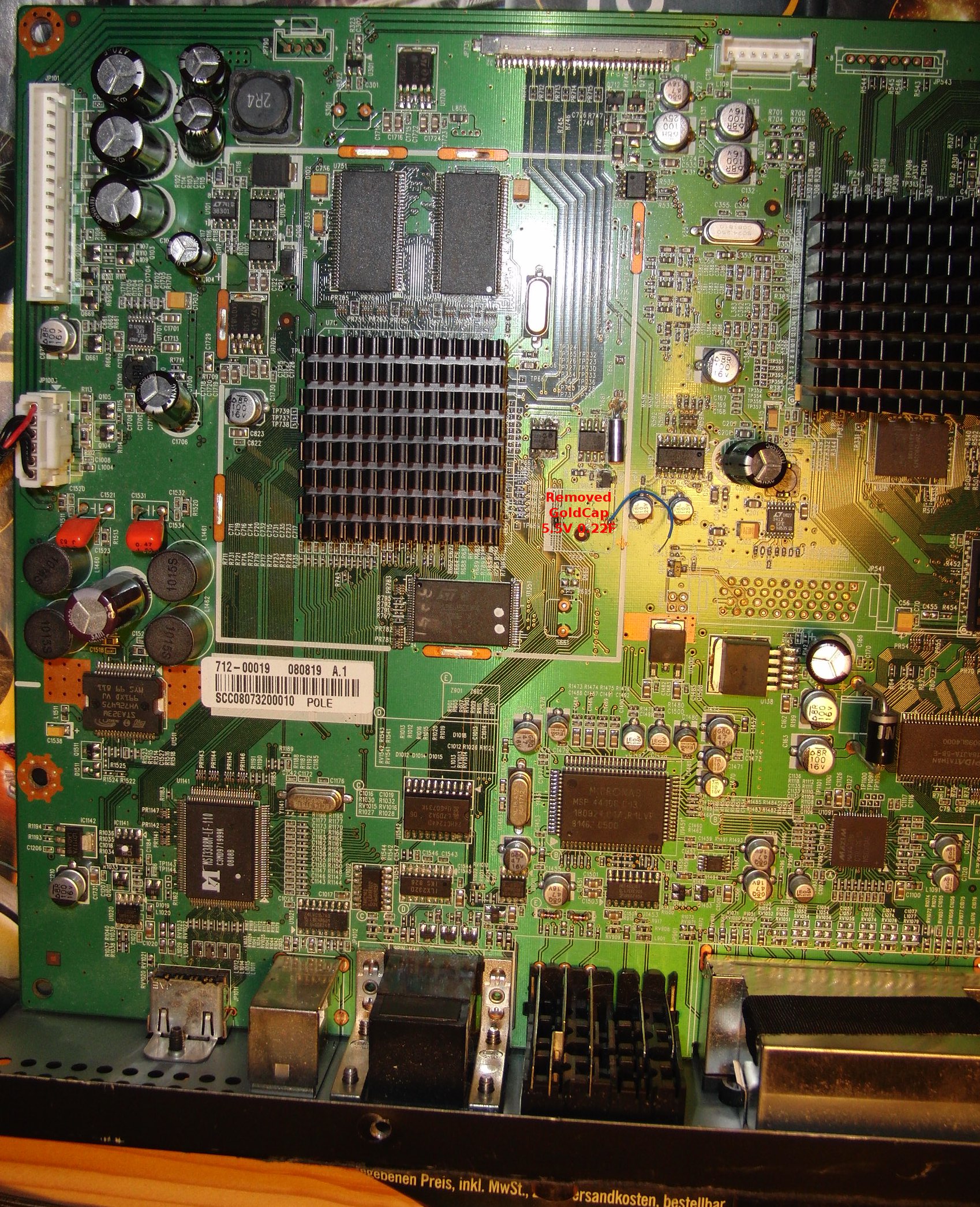 i try to repair a Humax 32IS51 32" lcd flat screen with integrated DVB-S2 tuner. The TV will not turn on and the status led just glow yellow/amber. Somebody in the other Forums mentioned that the data communication between the ic's on the mainboard is interrupted. The power supply seems to be in a good condition. Somebody resolder the pins at the IC U661 PCF8563T and then it works again. Another forum member change the supercap 5.5V 0.22F. Yesterday i cooled down my mainboard and then everything works well. Then i used my fingers to warm up the caps near the pin socket on the mainboard led glow yellow/amber . I ordered the caps now and hope it will work after change. I have a ESR Meter and will test the caps and will post the output here.